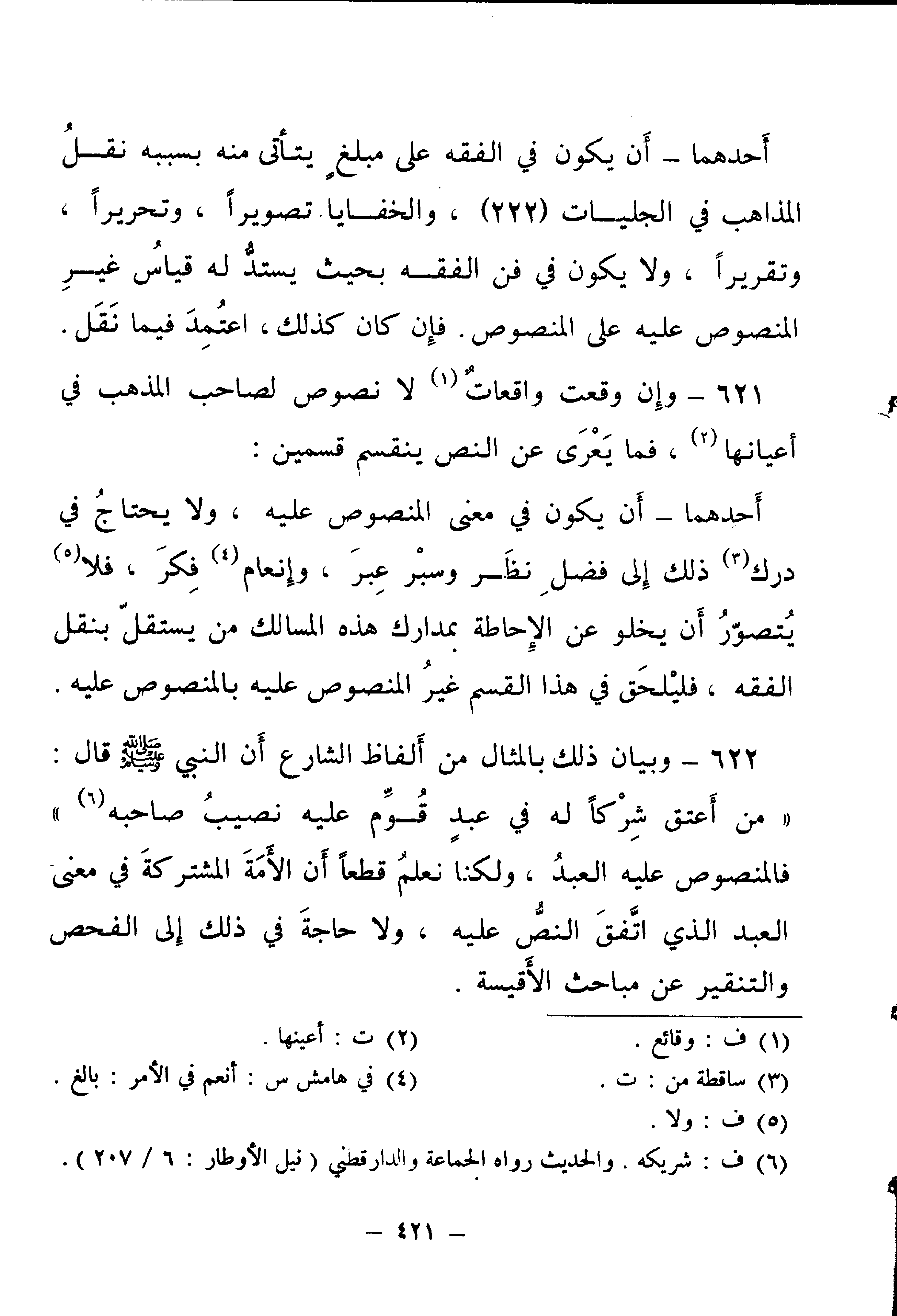 621 - وَإِنْ وَقَعَتْ وَاقِعَاتٌ لَا نُصُوصَ لِصَاحِبِ الْمَذْهَبِ فِي أَعْيَانِهَا، فَمَا تَعَرَّى عَنِ النَّصِّ يَنْقَسِمُ قِسْمَيْنِ: