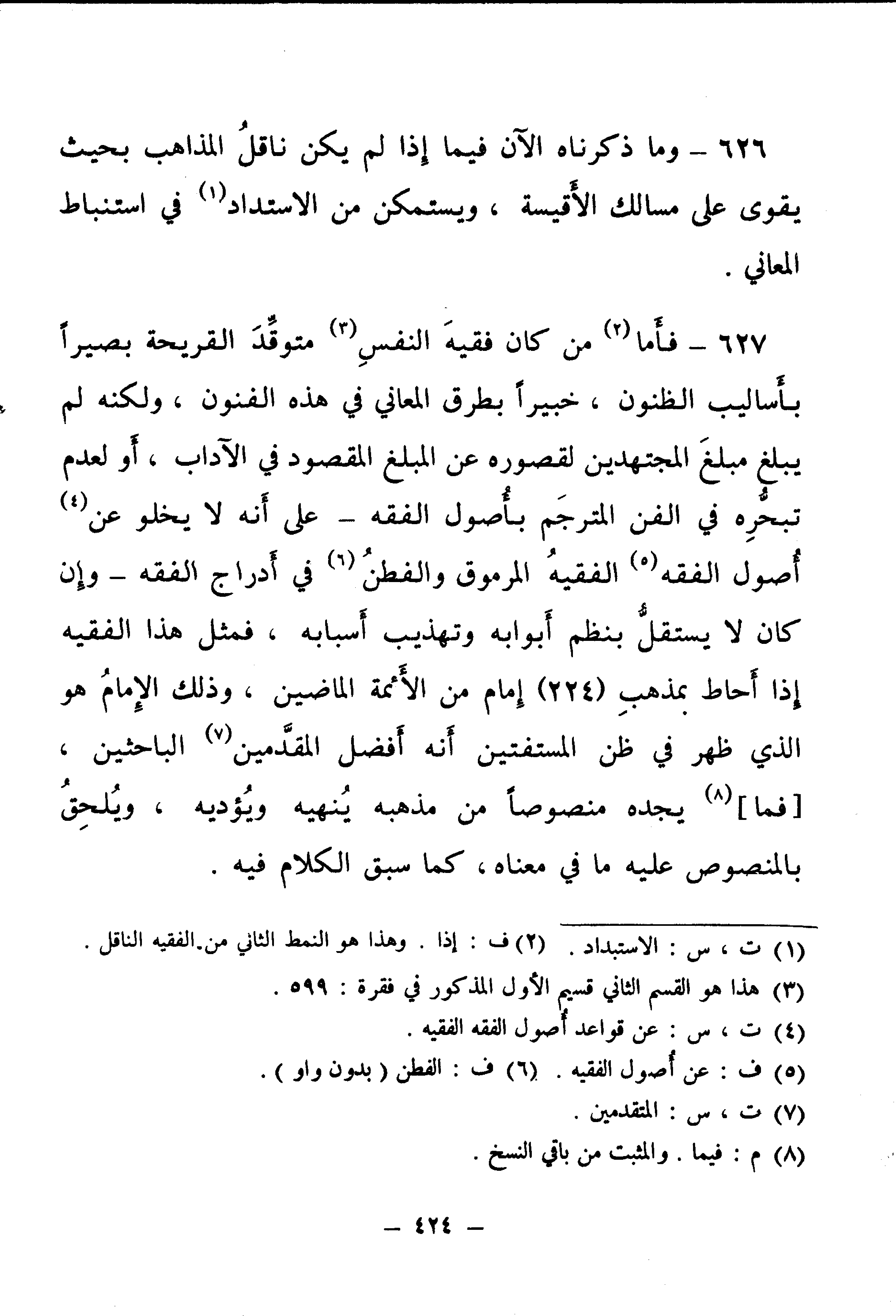 627 - فَأَمَّا مَنْ كَانَ فَقِيهَ النَّفْسِ، مُتَوَقِّدَ الْقَرِيحَةِ، بَصِيرًا بِأَسَالِيبِ الظُّنُونِ، خَبِيرًا بِطُرُقِ الْمَعَانِي فِي هَذِهِ الْفُنُونِ، وَلَكِنَّهُ لَمْ يَبْلُغْ مَبْلَغَ الْمُجْتَهِدِينَ، لِقُصُورِهِ عَنِ الْمَبْلَغِ الْمَقْصُودِ فِي الْآدَابِ أَوْ لِعَدَمِ تَبَحُّرِهِ فِي الْفَنِّ الْمُتَرْجَمِ بِأُصُولِ الْفِقْهِ - عَلَى أَنَّهُ لَا يَخْلُو عَنْ قَوَاعِدِ أُصُولِ الْفِقْهِ الْفَقِيهُ الْمَرْمُوقُ وَالْفَطِنُ فِي أَدْرَاجِ الْفِقْهِ - وَإِنْ كَانَ لَا يَسْتَقِلُّ بِنَظْمِ أَبْوَابِهِ، وَتَهْذِيبِ أَسْبَابِهِ، فَمِثْلُ هَذَا الْفَقِيهِ إِذَا أَحَاطَ بِمَذْهَبِ (224) إِمَامٍ مِنَ الْأَئِمَّةِ الْمَاضِينَ، وَذَلِكَ الْإِمَامُ هُوَ الَّذِي ظَهَرَ فِي ظَنِّ الْمُسْتَفْتِينَ أَنَّهُ أَفْضَلُ الْمُقَدَّمِينَ الْبَاحِثِينَ، [فَمَا] يَجِدُهُ مَنْصُوصًا مِنْ مَذْهَبِهِ يُنْهِيهِ وَيُؤَدِّيهِ، وَيَلْحَقُ بِالْمَنْصُوصِ عَلَيْهِ مَا فِي مَعْنَاهُ، كَمَا سَبَقَ الْكَلَامُ فِيهِ.