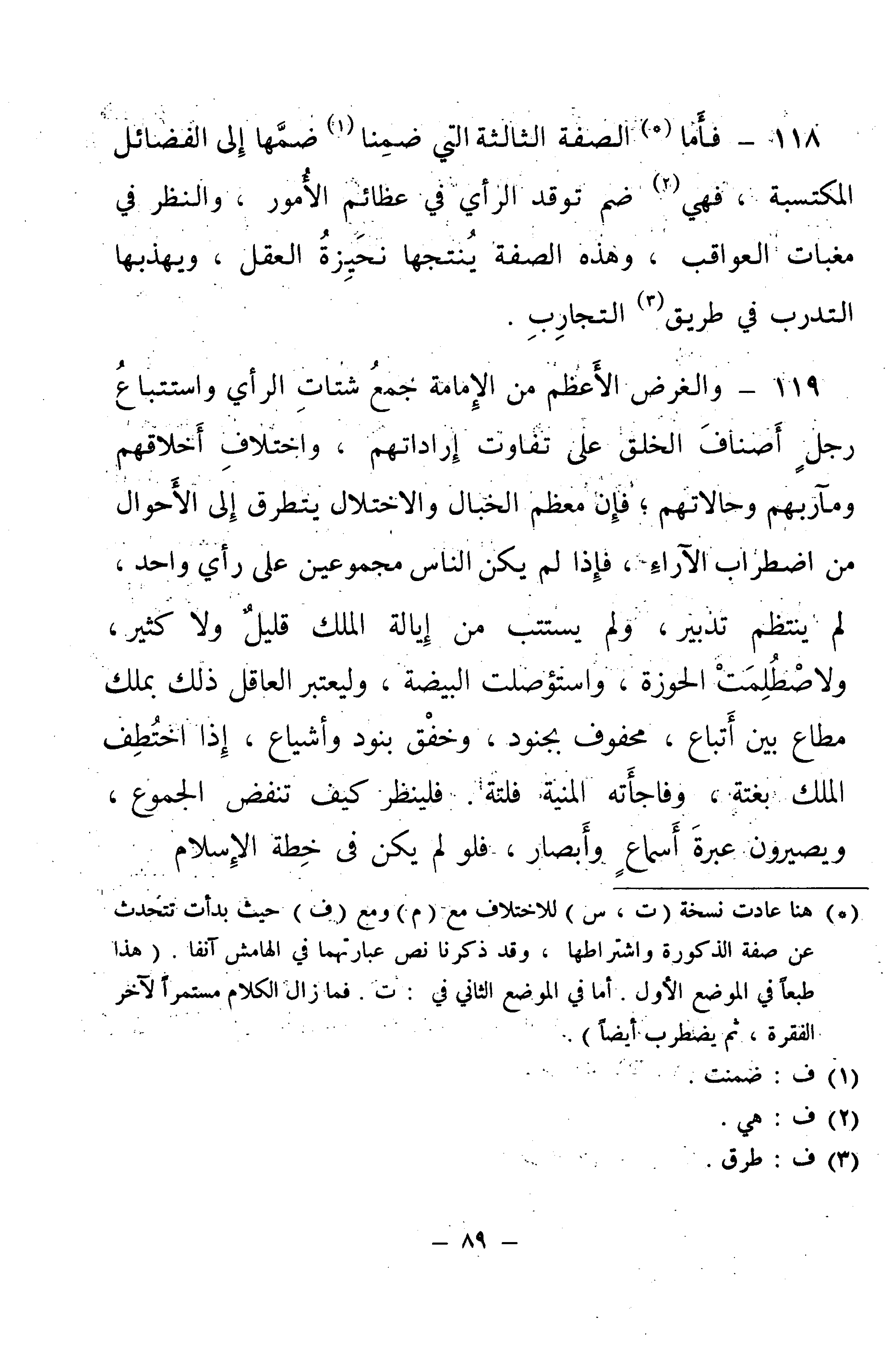 119 - فَأَمَّا الصِّفَةُ الثَّالِثَةُ الَّتِي ضَمِنَّا ضَمَّهَا إِلَى الْفَضَائِلِ الْمُكْتَسَبَةِ، فَهِيَ ضَمُّ تَوَقُّدِ الرَّأْيِ فِي عَظَائِمِ الْأُمُورِ، وَالنَّظَرِ فِي مَغَبَّاتِ الْعَوَاقِبِ، وَهَذِهِ الصِّفَةُ يُنْتِجُهَا نَحِيزَةُ الْعَقْلِ، وَيُهَذِّبُهَا التَّدْرِيبُ فِي طُرُقِ التَّجَارِبِ.