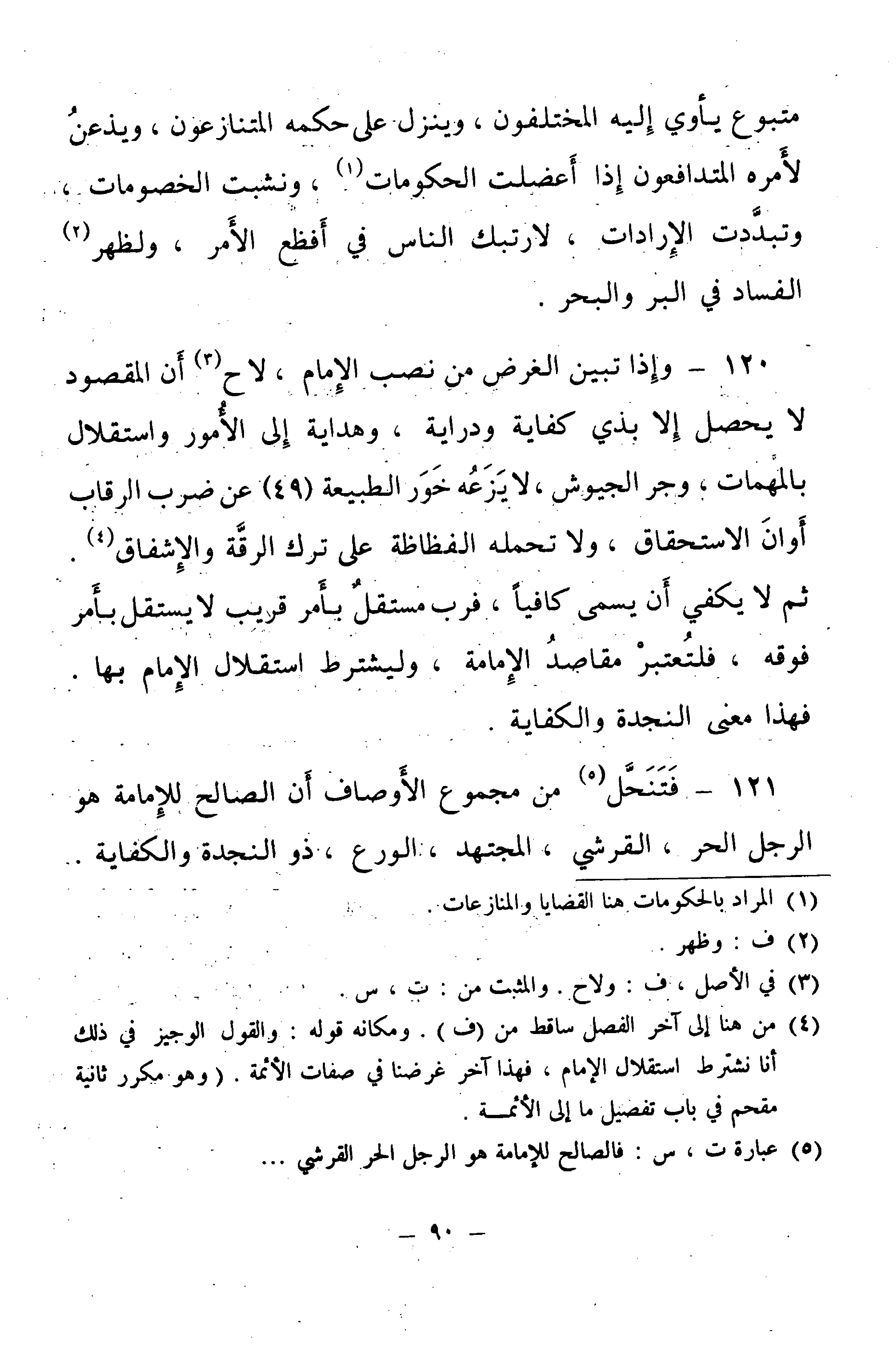 121 - فَتَنَحَّلَ مِنْ مَجْمُوعِ هَذِهِ الْأَوْصَافِ أَنَّ الصَّالِحَ لِلْإِمَامَةِ هُوَ الرَّجُلُ الْحُرُّ، الْقُرَشِيُّ، الْمُجْتَهِدُ، الْوَرِعُ، ذُو النَّجْدَةِ وَالْكِفَايَةِ.