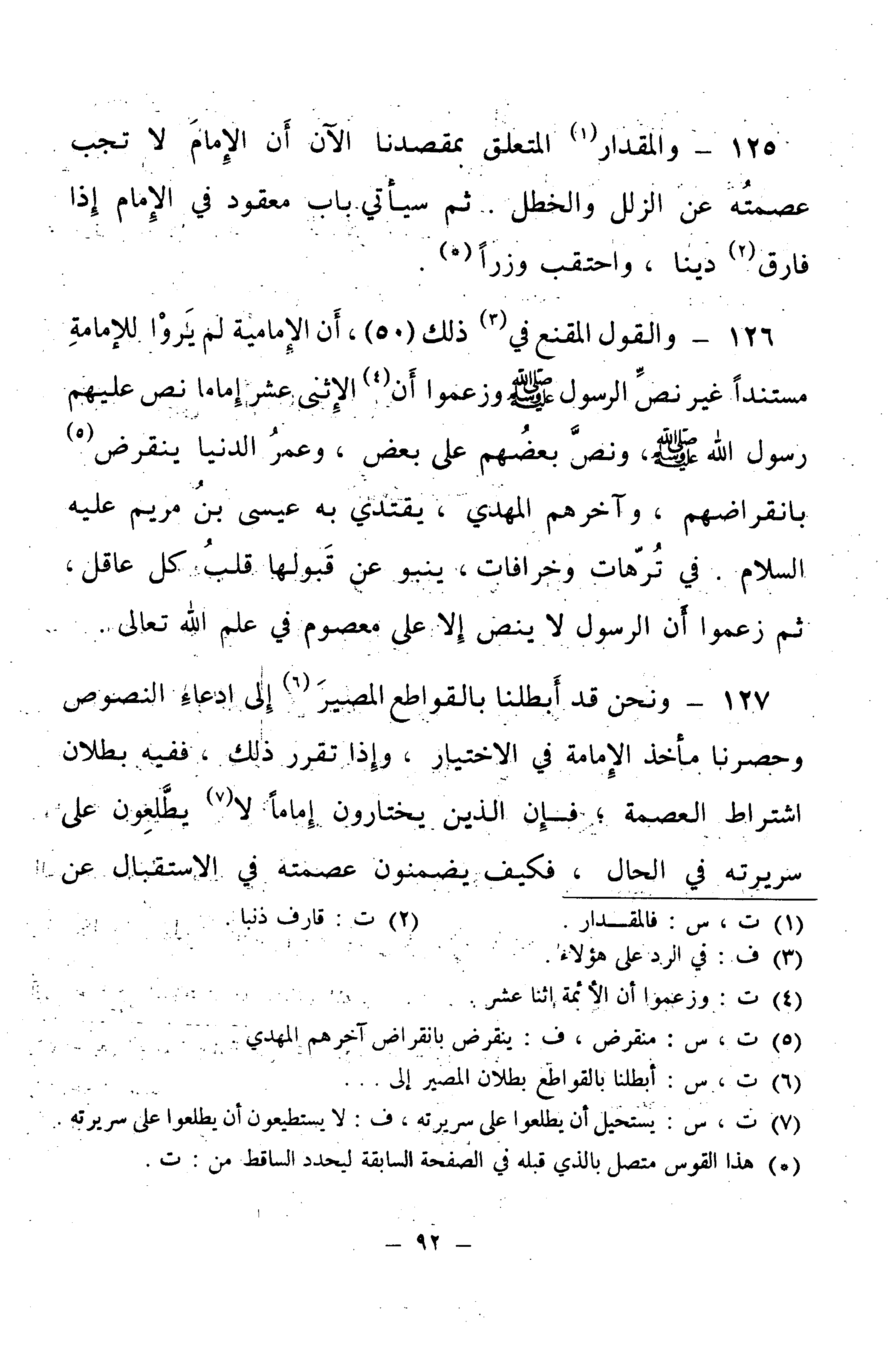 126 - وَالْقَوْلُ الْمُقْنِعُ فِي ذَلِكَ أَنَّ الْإِمَامِيَّةَ لَمْ يَرَوْا لِلْإِمَامَةِ مُسْتَنَدًا، غَيْرَ نَصِّ الرَّسُولِ - صَلَّى اللَّهُ عَلَيْهِ وَسَلَّمَ - وَزَعَمُوا أَنَّ الْإِثْنَيْ عَشَرَ إِمَامًا نَصَّ عَلَيْهِمْ رَسُولُ اللَّهِ - صَلَّى اللَّهُ عَلَيْهِ وَسَلَّمَ - وَنَصَّ بَعْضُهُمْ عَلَى بَعْضٍ، وَعُمْرُ الدُّنْيَا يَنْقَرِضُ بِانْقِرَاضِهِمْ، وَآخِرُهُمُ الْمَهْدِيُّ، يَقْتَدِي بِهِ عِيسَى ابْنُ مَرْيَمَ - عَلَيْهِ السَّلَامُ - فِي تُرَّهَاتٍ وَخُرَافَاتٍ، يَنْبُو عَنْ قَبُولِهَا قَلْبُ كُلِّ عَاقِلٍ. ثُمَّ زَعَمُوا أَنَّ الرَّسُولَ لَا يَنُصُّ إِلَّا عَلَى مَعْصُومٍ فِي عِلْمِ اللَّهِ تَعَالَى.