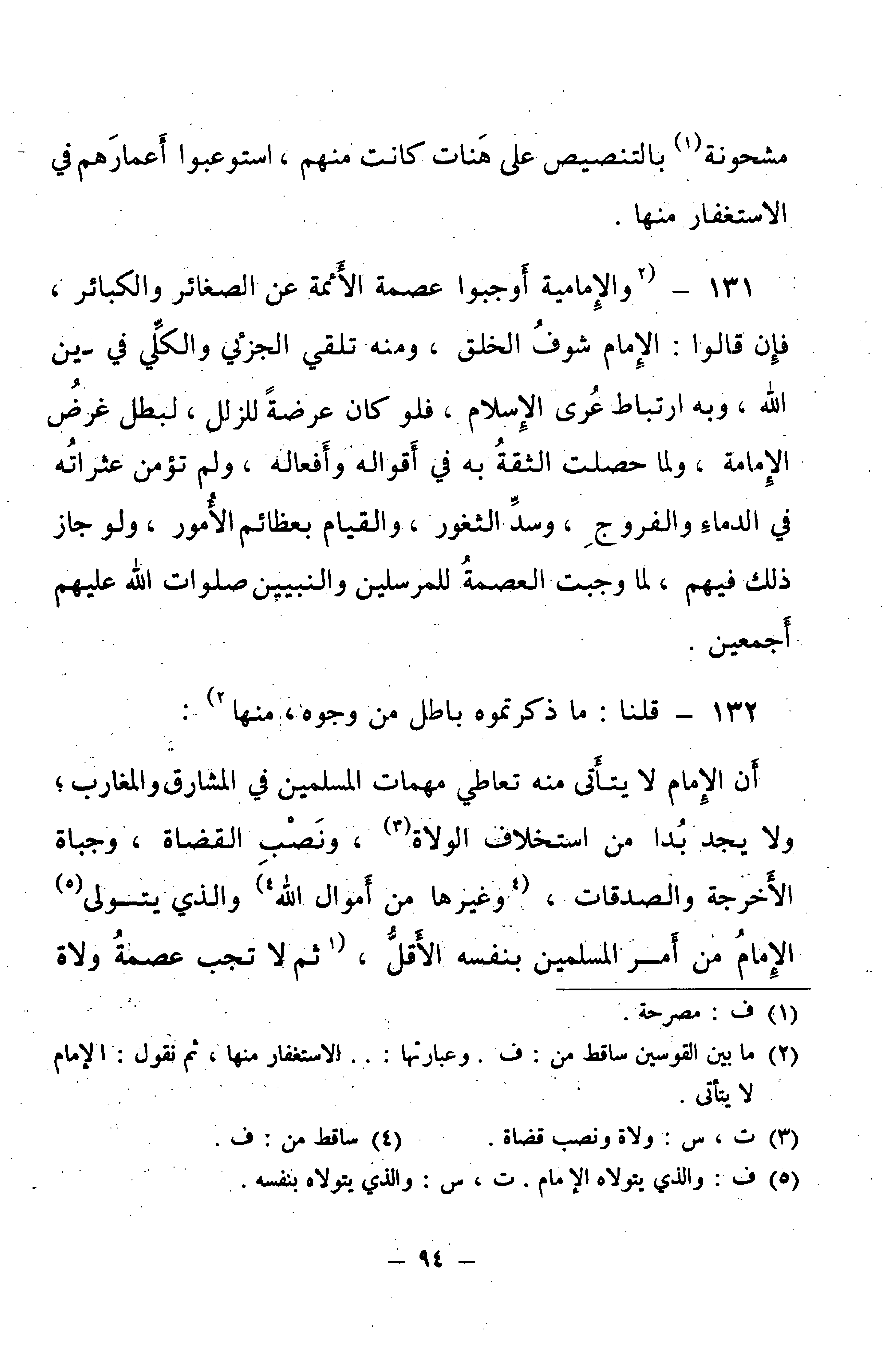 131 - وَالْإِمَامِيَّةُ أَوْجَبُوا عِصْمَةَ الْأَئِمَّةِ عَنِ الصَّغَائِرِ وَالْكَبَائِرِ، فَإِنْ قَالُوا: الْإِمَامُ شَوْفُ الْخَلْقِ، وَمِنْهُ تَلَقِّي الْجُزْئِيِّ وَالْكُلِّيِّ فِي دِينِ اللَّهِ، وَبِهِ ارْتِبَاطُ عُرَى الْإِسْلَامِ، فَلَوْ كَانَ عُرْضَةً لِلزَّلَلِ، لَبَطَلَ غَرَضُ الْإِمَامَةِ، وَلَمَا حَصَلَتِ الثِّقَةُ بِهِ فِي أَقْوَالِهِ وَأَفْعَالِهِ، وَلَمْ تُؤْمَنْ عَثَرَاتُهُ فِي الدِّمَاءِ وَالْفُرُوجِ، وَسَدِّ الثُّغُورِ، وَالْقِيَامِ بِعَظَائِمَ الْأُمُورِ، وَلَوْ جَازَ ذَلِكَ فِيهِمْ، لَمَا وَجَبَتِ الْعِصْمَةُ لِلْمُرْسَلِينَ وَالنَّبِيِّينَ - صَلَوَاتُ اللَّهِ عَلَيْهِمْ أَجْمَعِينَ.