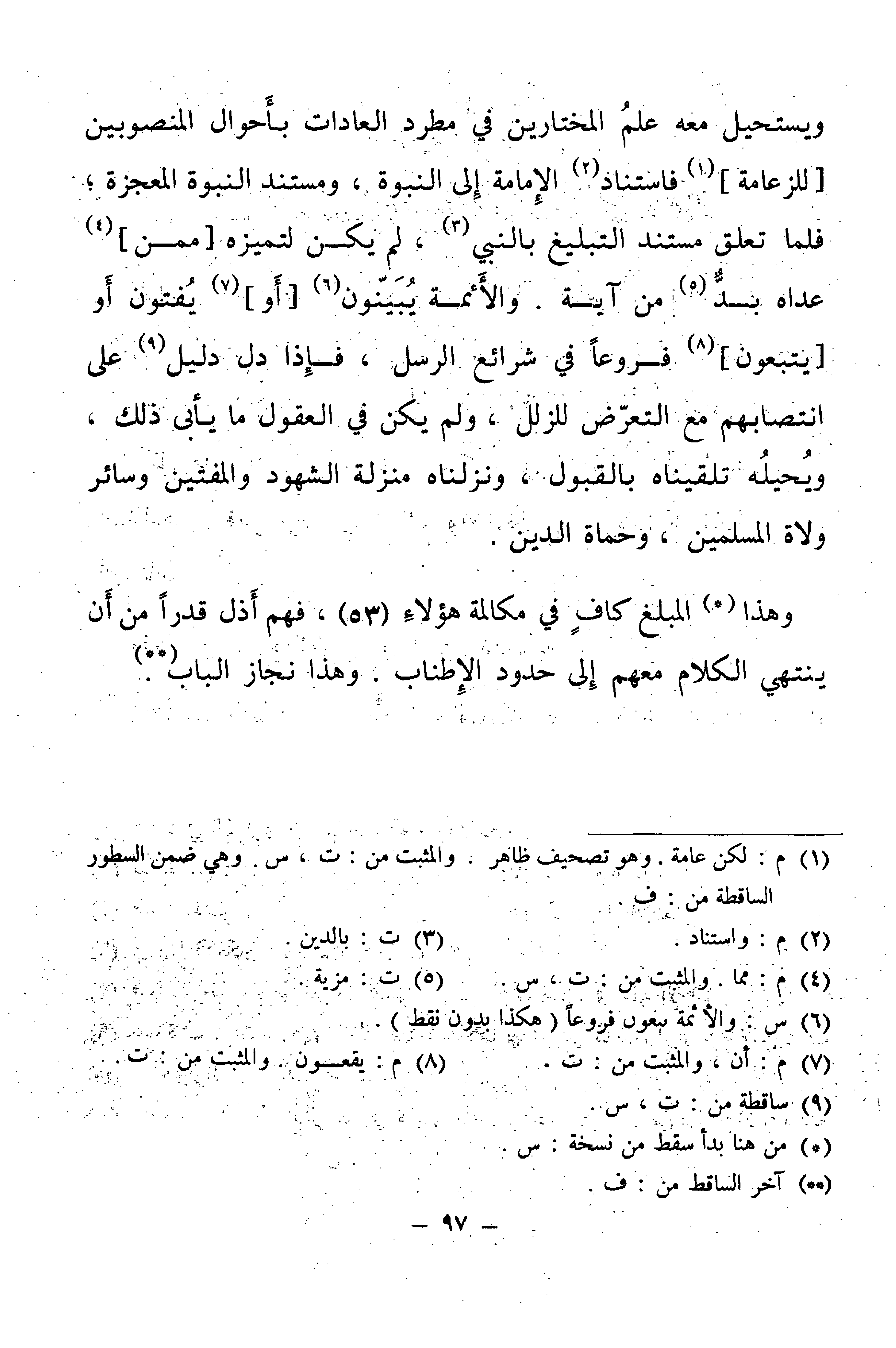 وَيَسْتَحِيلُ مَعَهُ عِلْمُ الْمُخْتَارِينَ فِي مُطَّرَدِ الْعَادَاتِ بِأَحْوَالِ الْمَنْصُوبِينَ لِلزَّعَامَةِ، فَاسْتِنَادُ الْإِمَامَةِ إِلَى النُّبُوَّةِ، وَمُسْتَنَدُ النُّبُوَّةِ الْمُعْجِزَةُ، فَلَمَّا تَعَلَّقْ مُسْتَنَدُ التَّبْلِيغِ بِالنَّبِيِّ، لَمْ يَكُنْ لِتَمَيُّزِهِ مِمَّنْ عَدَاهُ بُدٌّ مِنْ آيَةٍ. وَالْأَئِمَّةُ يُبَيِّنُونَ أَوْ يُفْتُونَ أَوْ يَتَّبِعُونَ فُرُوعًا فِي شَرَائِعِ الرُّسُلِ، فَإِذَا دَلَّ دَلِيلٌ عَلَى انْتِصَابِهِمْ مَعَ التَّعَرُّضِ لِلزَّلَلِ، وَلَمْ يَكُنْ فِي الْعُقُولِ مَا يَأْبَى ذَلِكَ، وَيُحِيلُهُ تَلَقَّيْنَاهُ بِالْقَبُولِ، وَنَزَّلْنَاهُ مَنْزِلَةَ الشُّهُودِ وَالْمُفْتِينَ وَسَائِرِ وُلَاةِ الْمُسْلِمِينَ، وَحُمَاةِ الدِّينِ.