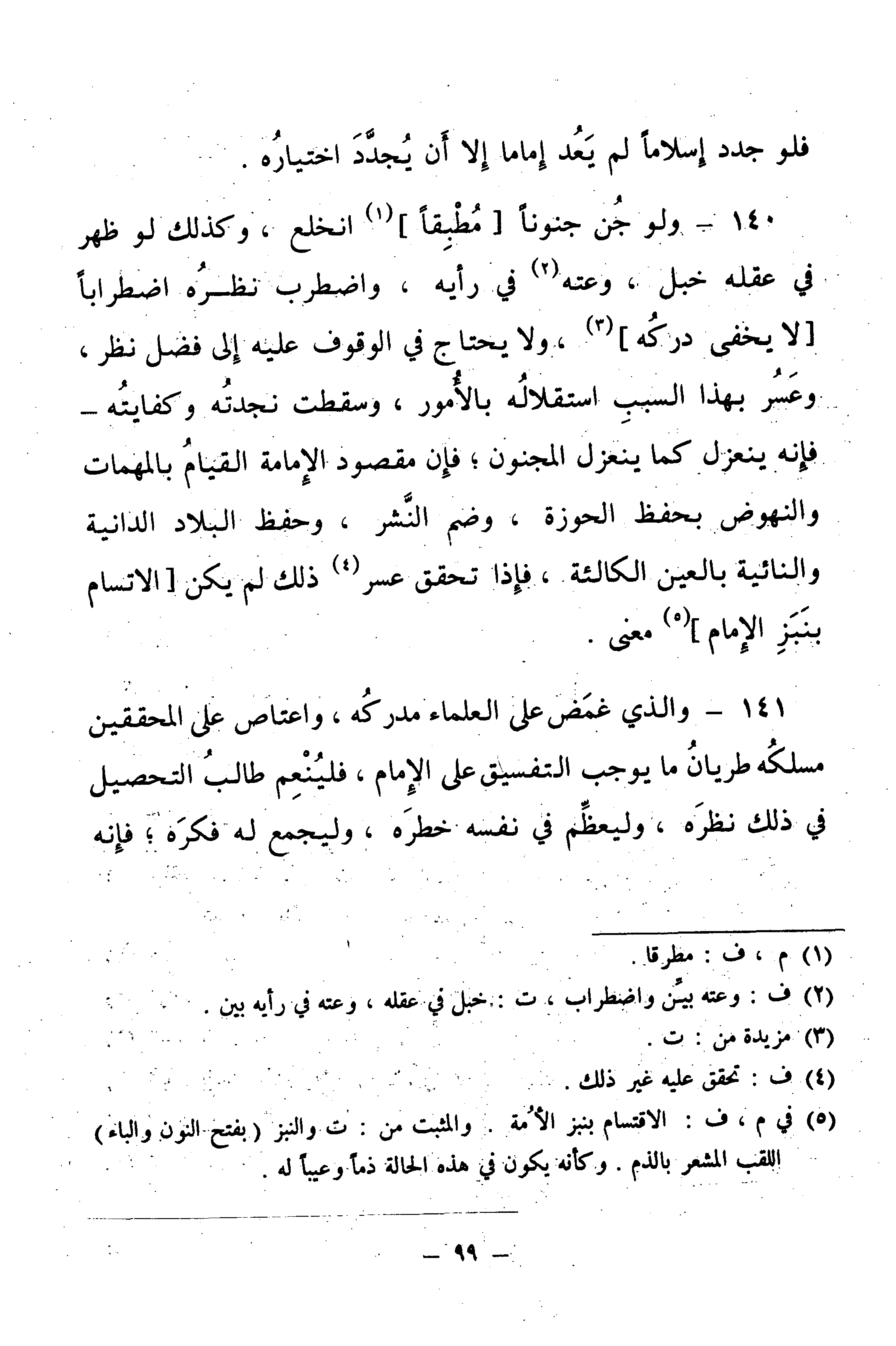 141 - وَالَّذِي غَمُضَ عَلَى الْعُلَمَاءِ مَدْرَكُهُ، وَاعْتَاصَ عَلَى الْمُحَقِّقِينَ مَسْلَكُهُ طَرَيَانُ مَا يُوجِبُ التَّفْسِيقَ عَلَى الْإِمَامِ، فَلْيُنْعِمْ طَالِبُ التَّحْصِيلِ فِي ذَلِكَ نَظَرَهُ، وَلْيُعَظِّمْ فِي نَفْسِهِ خَطَرَهُ، وَلْيَجْمَعْ لَهُ فِكْرَهُ ; فَإِنَّهُ