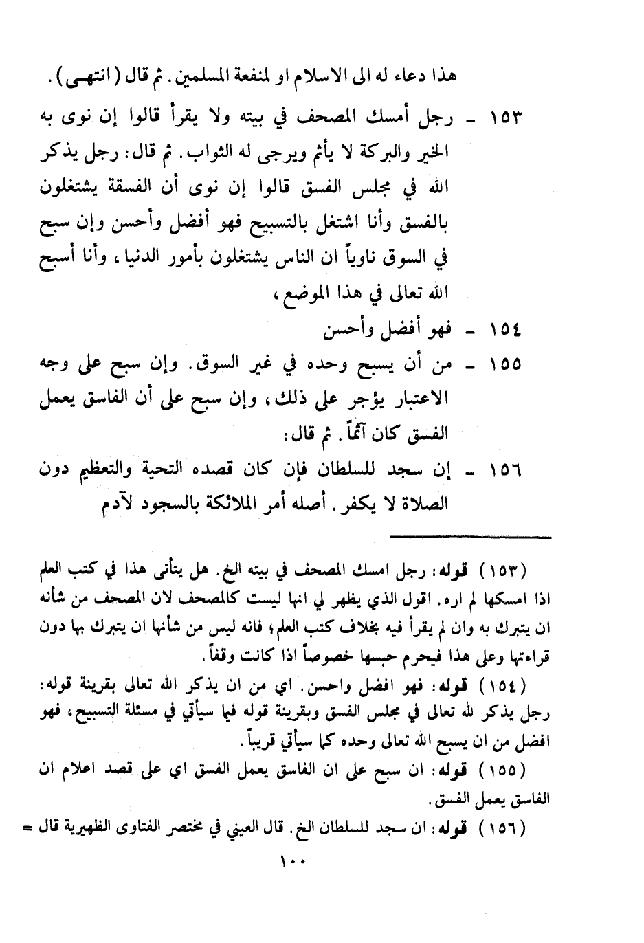 153 - رَجُلٌ أَمْسَكَ الْمُصْحَفَ فِي بَيْتِهِ وَلَا يَقْرَأُ قَالُوا إنْ نَوَى بِهِ الْخَيْرَ وَالْبَرَكَةَ لَا يَأْثَمُ وَيُرْجَى لَهُ الثَّوَابُ.