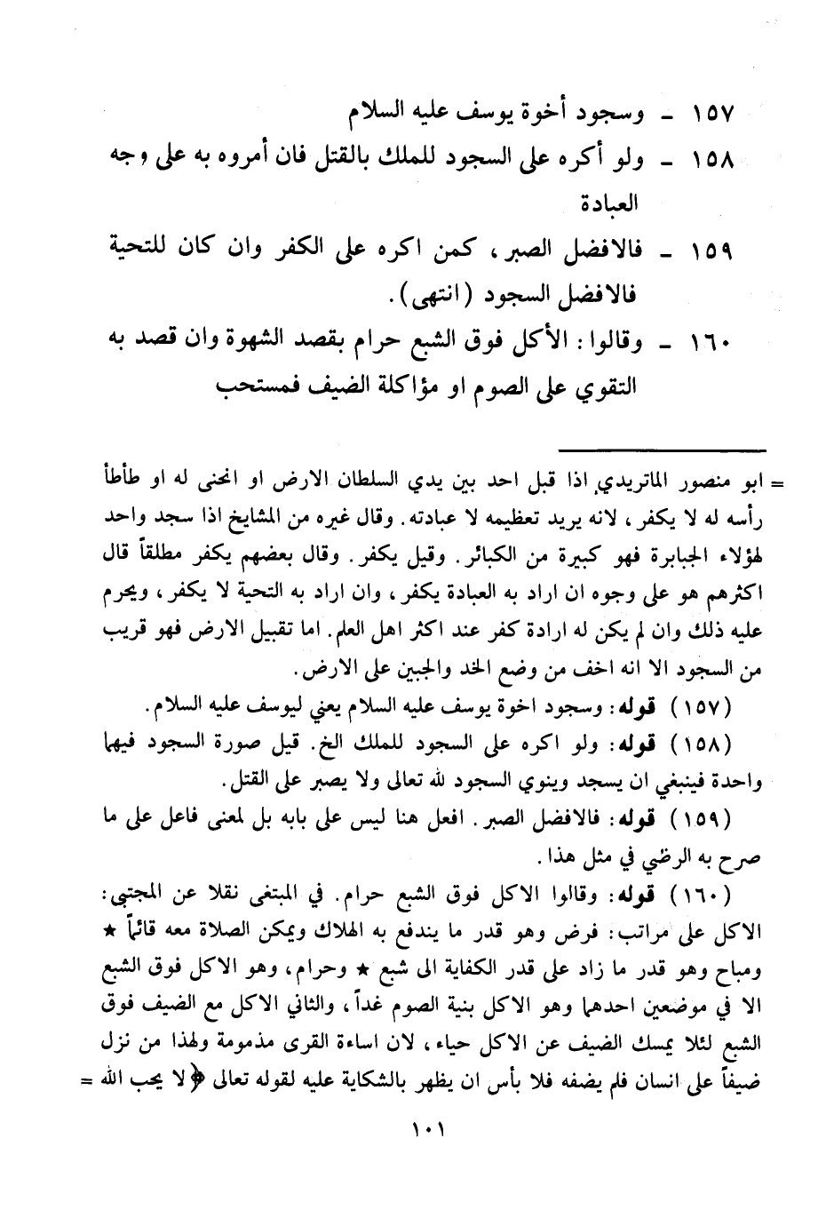 158 - وَلَوْ أُكْرِهَ عَلَى السُّجُودِ لِلْمَلِكِ بِالْقَتْلِ فَإِنْ أَمَرُوهُ بِهِ عَلَى وَجْهِ الْعِبَادَةِ 159 - فَالْأَفْضَلُ الصَّبْرُ، كَمَنْ أُكْرِهَ عَلَى الْكُفْرِ وَإِنْ كَانَ لِلتَّحِيَّةِ فَالْأَفْضَلُ السُّجُودُ (انْتَهَى)