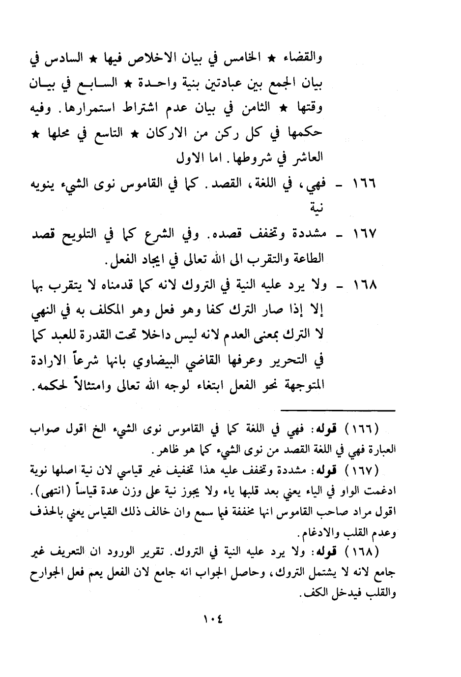(167) قَوْلُهُ: مُشَدَّدَةٌ وَتُخَفَّفُ عَلَيْهِ هَذَا تَخْفِيفٌ غَيْرُ قِيَاسِيٍّ لِأَنَّ نِيَّةَ أَصْلُهَا نِوْيَةٌ أُدْغِمَتْ الْوَاوُ فِي الْيَاءِ يَعْنِي بَعْدَ قَلْبِهَا يَاءٍ وَلَا يَجُوزُ نِيَةٌ عَلَى وَزْنِ عِدَّةٌ قِيَاسًا (انْتَهَى) .