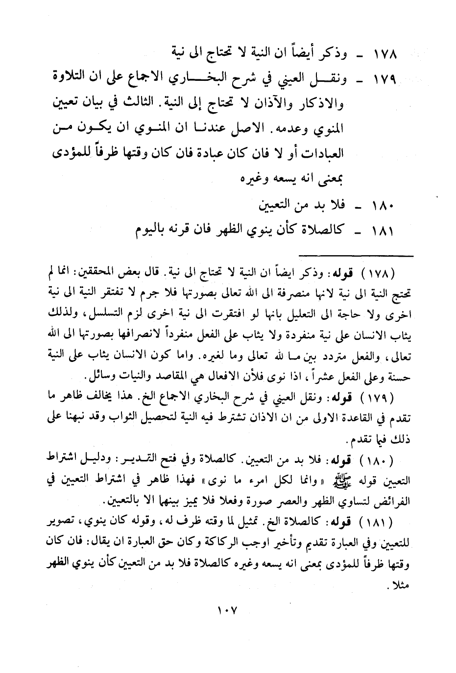 وَذَكَرَ أَيْضًا أَنَّ النِّيَّةَ لَا تَحْتَاجُ إلَى نِيَّةٍ 179 - وَنَقَلَ الْعَيْنِيُّ فِي شَرْحِ الْبُخَارِيِّ الْإِجْمَاعَ عَلَى أَنَّ التِّلَاوَةَ وَالْأَذْكَارَ وَالْآذَانَ لَا تَحْتَاجُ إلَى النِّيَّةِ