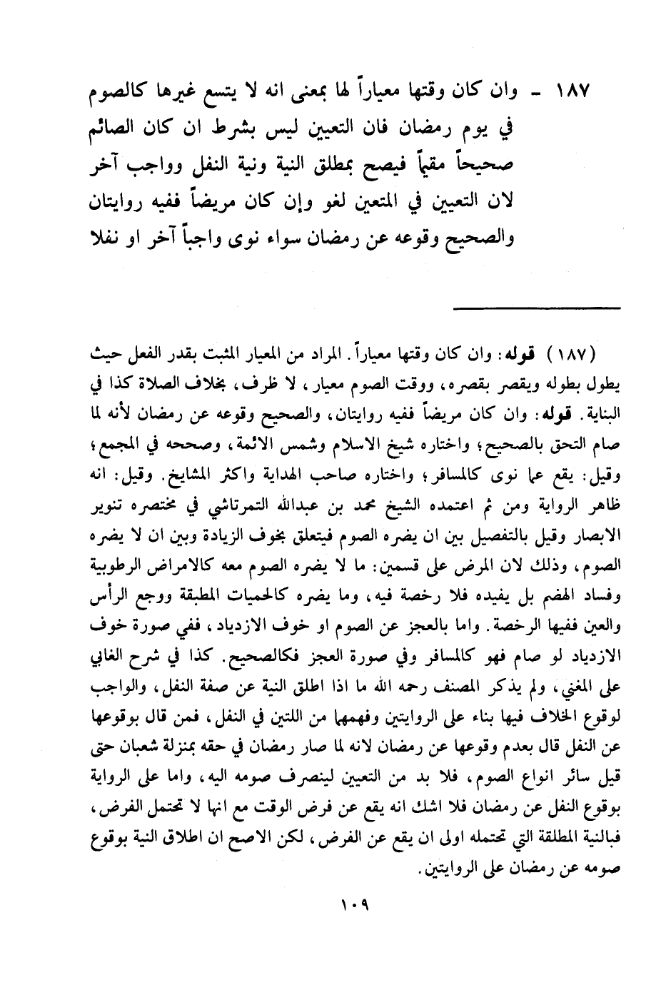 وَقِيلَ: إنَّهُ ظَاهِرُ الرِّوَايَةِ وَمِنْ ثَمَّ اعْتَمَدَهُ الشَّيْخُ مُحَمَّدُ بْنُ عَبْدِ اللَّهِ التُّمُرْتَاشِيُّ فِي مُخْتَصَرِهِ تَنْوِيرِ الْأَبْصَارِ وَقِيلَ بِالتَّفْصِيلِ بَيْنَ أَنْ يَضُرَّهُ الصَّوْمُ فَيَتَعَلَّقُ بِخَوْفِ الزِّيَادَةِ وَبَيْنَ أَنْ لَا يَضُرَّهُ الصَّوْمُ، وَذَلِكَ لِأَنَّ الْمَرَضَ عَلَى قِسْمَيْنِ: مَا لَا يَضُرُّهُ الصَّوْمُ.