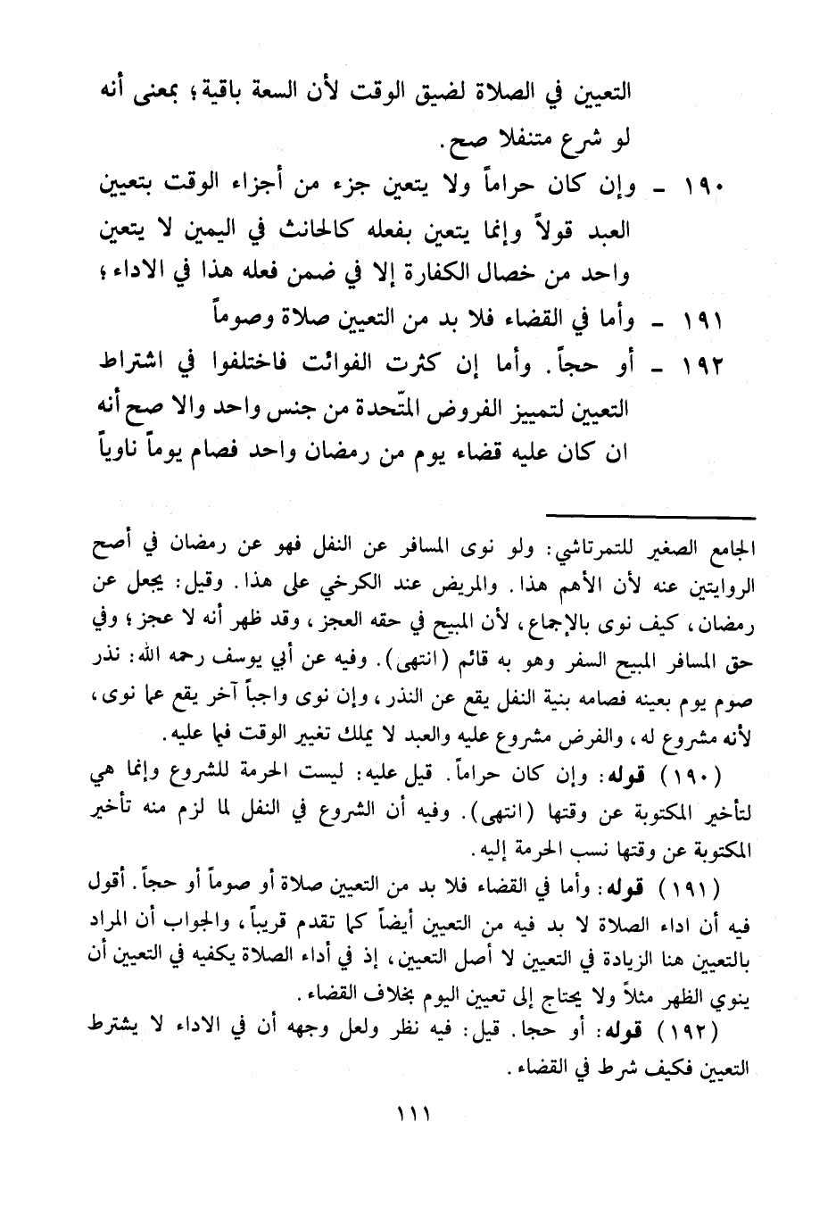 وَلَا يَتَعَيَّنُ جُزْءٌ مِنْ أَجْزَاءِ الْوَقْتِ بِتَعْيِينِ الْعَبْدِ قَوْلًا وَإِنَّمَا يَتَعَيَّنُ بِفِعْلِهِ كَالْحَانِثِ فِي الْيَمِينِ لَا يَتَعَيَّنُ وَاحِدٌ مِنْ خِصَالِ الْكَفَّارَةِ إلَّا فِي ضِمْنِ فِعْلِهِ هَذَا فِي الْأَدَاءِ؛ 191 - وَأَمَّا فِي الْقَضَاءِ فَلَا بُدَّ مِنْ التَّعْيِينِ صَلَاةً وَصَوْمًا 192 - أَوْ حَجًّا