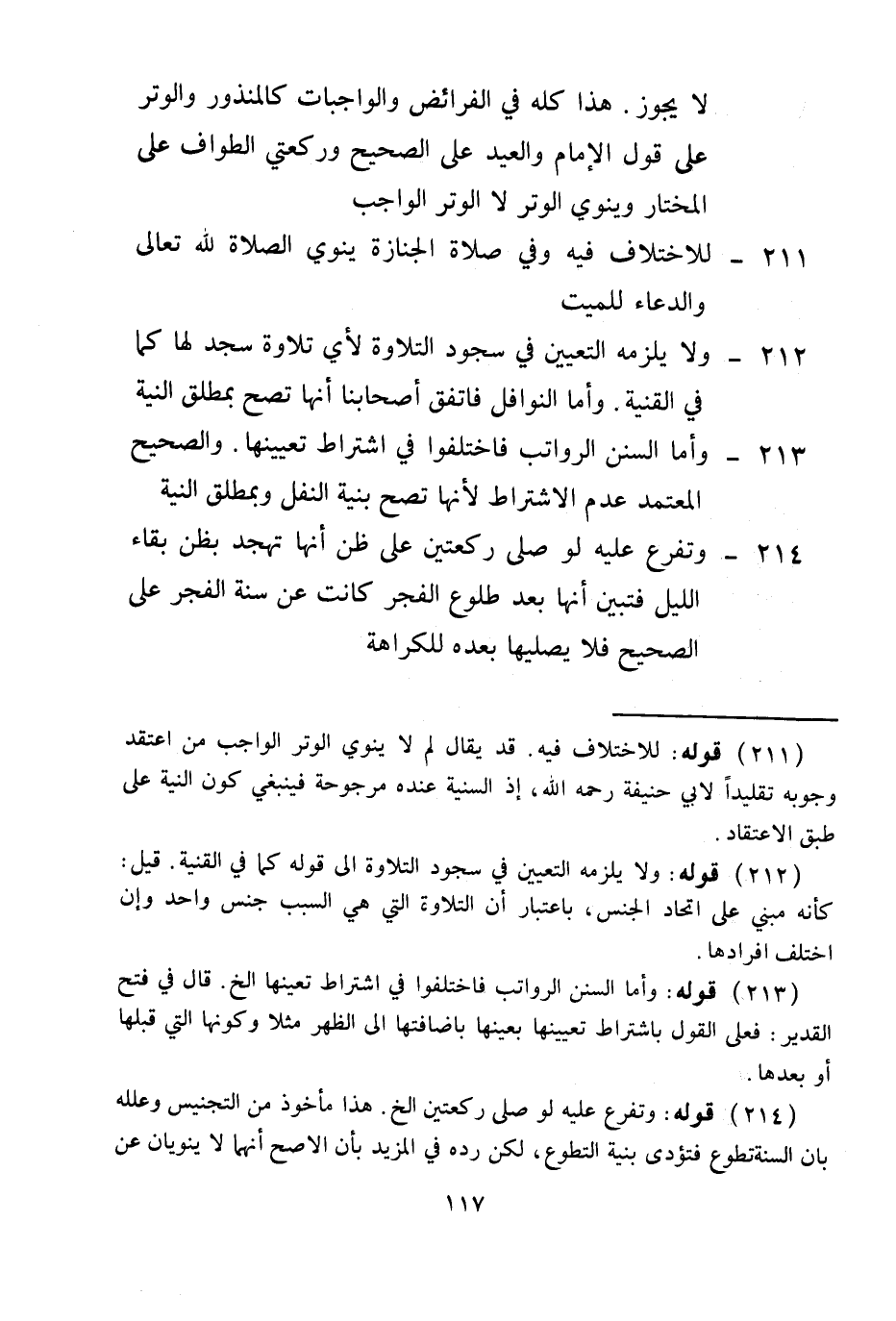 هَذَا كُلُّهُ فِي الْفَرَائِضِ وَالْوَاجِبَاتِ كَالْمَنْذُورِ وَالْوِتْرِ عَلَى قَوْلِ الْإِمَامِ وَالْعِيدِ عَلَى الصَّحِيحِ وَرَكْعَتَيْ الطَّوَافِ عَلَى الْمُخْتَارِ وَيَنْوِي الْوِتْرَ لَا الْوِتْرَ الْوَاجِبَ 211 - لِلِاخْتِلَافِ فِيهِ وَفِي صَلَاةِ الْجِنَازَةِ يَنْوِي الصَّلَاةَ لِلَّهِ تَعَالَى وَالدُّعَاءَ لِلْمَيِّتِ