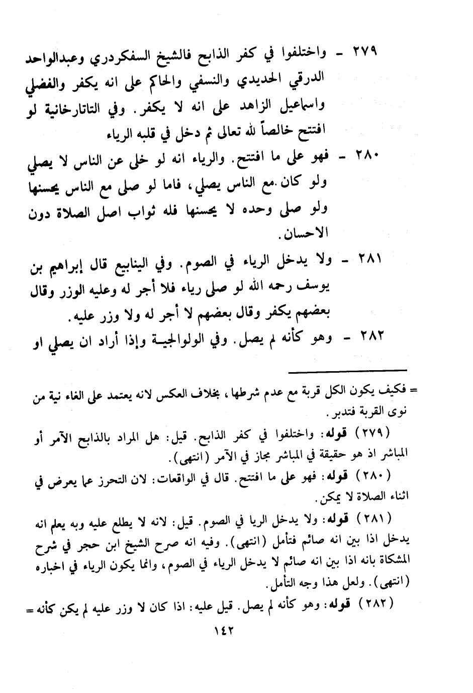 وَفِي الْيَنَابِيعِ قَالَ إبْرَاهِيمُ بْنُ يُوسُفَ - رَحِمَهُ اللَّهُ - لَوْ صَلَّى رِيَاءً فَلَا أَجْرَ لَهُ وَعَلَيْهِ الْوِزْرُ وَقَالَ بَعْضُهُمْ يُكَفَّرُ وَقَالَ بَعْضُهُمْ لَا أَجْرَ لَهُ وَلَا وِزْرَ عَلَيْهِ. 282 -