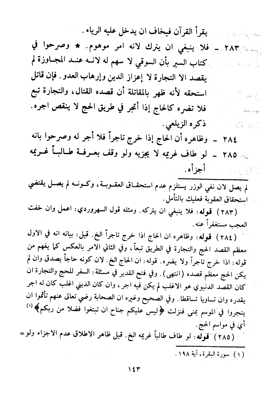 (284) قَوْلُهُ: وَظَاهِرُهُ أَنَّ الْحَاجَّ إذَا خَرَجَ تَاجِرًا إلَخْ.