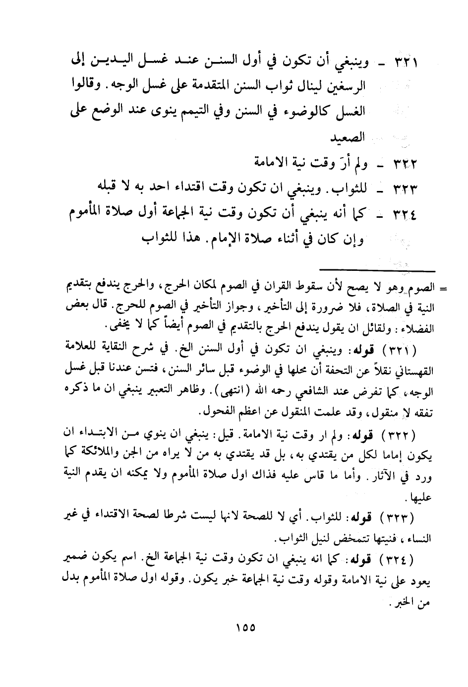 322 - وَلَمْ أَرَ وَقْتَ نِيَّةِ الْإِمَامَةِ 323 - لِلثَّوَابِ، وَيَنْبَغِي أَنْ تَكُونَ وَقْتَ اقْتِدَاءِ أَحَدٍ بِهِ لَا قَبْلَهُ 324 - كَمَا أَنَّهُ يَنْبَغِي أَنْ تَكُونَ وَقْتَ نِيَّةِ الْجَمَاعَةِ أَوَّلَ صَلَاةِ الْمَأْمُومِ، وَإِنْ كَانَ فِي أَثْنَاءِ صَلَاةِ الْإِمَامِ، هَذَا لِلثَّوَابِ