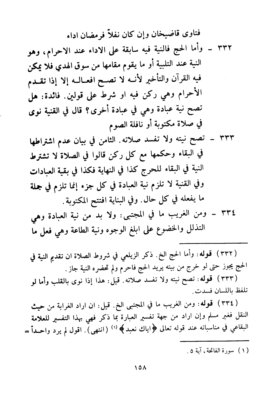 (334) قَوْلُهُ: وَمَنْ الْغَرِيبِ مَا فِي الْمُجْتَبَى إلَخْ، قِيلَ: إنْ أَرَادَ الْغَرَابَةَ مِنْ حَيْثُ النَّقْلُ فَغَيْرُ مُسَلَّمٍ، وَإِنْ أَرَادَ مِنْ جِهَةِ تَفْسِيرِ الْعِبَارَةِ بِمَا ذَكَرَ فَهِيَ بِهَذَا التَّفْسِيرِ لِلْعَلَّامَةِ الْبِقَاعِيِّ فِي مُنَاسِبَاتِهِ عِنْدَ قَوْله تَعَالَى {إِيَّاكَ نَعْبُدُ} [الفاتحة: 5] (انْتَهَى) . أَقُولُ: لَمْ يُرِدْ وَاحِدًا