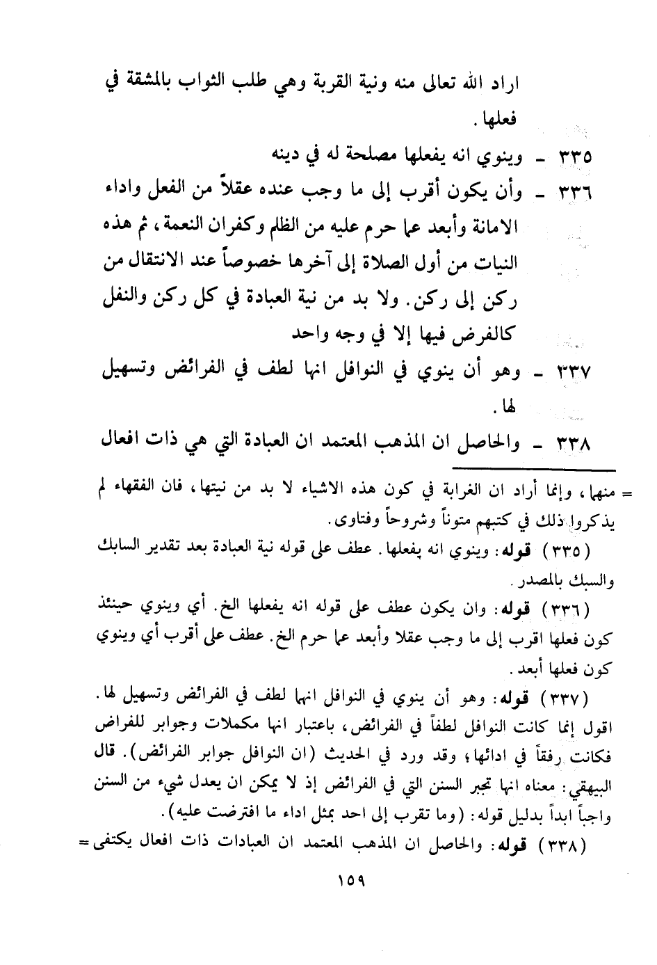 أَرَادَ اللَّهُ تَعَالَى مِنْهُ وَنِيَّةِ الْقُرْبَةِ، وَهِيَ طَلَبُ الثَّوَابِ بِالْمَشَقَّةِ فِي فِعْلِهَا 335 - وَيَنْوِي أَنَّهُ يَفْعَلُهَا مَصْلَحَةً لَهُ فِي دِينِهِ 336 -، وَأَنْ يَكُونَ أَقْرَبَ إلَى مَا وَجَبَ عِنْدَهُ عَقْلًا مِنْ الْفِعْلِ وَأَدَاءِ الْأَمَانَةِ وَأَبْعَدَ عَمَّا حُرِّمَ عَلَيْهِ مِنْ الظُّلْمِ وَكُفْرَانِ النِّعْمَةِ، ثُمَّ هَذِهِ النِّيَّاتُ مِنْ أَوَّلِ الصَّلَاةِ إلَى آخِرِهَا خُصُوصًا عِنْدَ الِانْتِقَال مِنْ رُكْنٍ إلَى رُكْنٍ، وَلَا بُدَّ مِنْ نِيَّةِ الْعِبَادَةِ فِي كُلِّ رُكْنٍ، وَالنَّفَلُ كَالْفَرْضِ فِيهَا إلَّا فِي وَجْهٍ وَاحِدٍ 337 - وَهُوَ أَنْ يَنْوِيَ فِي النَّوَافِلِ أَنَّهَا لُطْفٌ فِي الْفَرَائِضِ وَتَسْهِيلٌ لَهَا 338 - وَالْحَاصِلُ أَنَّ الْمَذْهَبَ الْمُعْتَمَدَ أَنَّ الْعِبَادَةَ الَّتِي هِيَ ذَاتُ أَفْعَالٍ