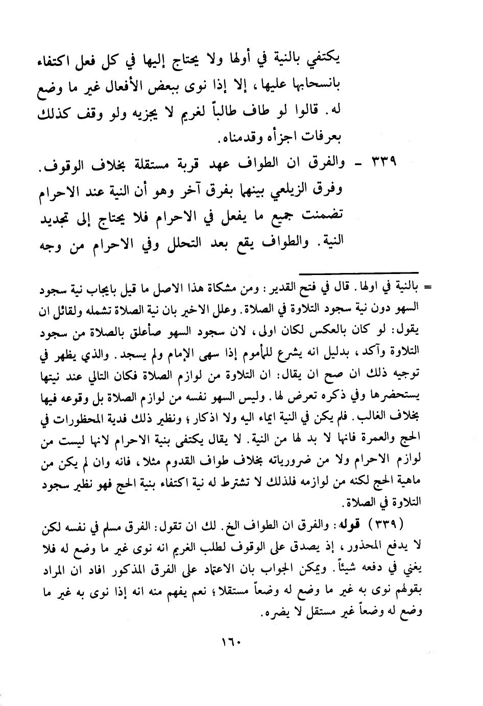 339 - وَالْفَرْقُ أَنَّ الطَّوَافَ عَهْدُ قُرْبَةٍ مُسْتَقِلَّةٍ بِخِلَافِ الْوُقُوفِ، وَفَرَّقَ الزَّيْلَعِيُّ بَيْنَهُمَا بِفَرْقٍ آخَرَ، وَهُوَ أَنَّ النِّيَّةَ عِنْدَ الْإِحْرَامِ تَضَمَّنَتْ جَمِيعَ مَا يَفْعَلُ فِي الْإِحْرَامِ فَلَا يَحْتَاجُ إلَى تَجْدِيدِ النِّيَّةِ، وَالطَّوَافُ يَقَعُ بَعْدَ التَّحَلُّلِ وَفِي الْإِحْرَامِ مِنْ وَجْهٍ