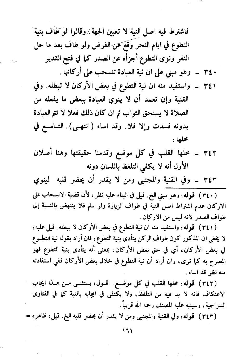 فَاشْتُرِطَ فِيهِ أَصْلُ النِّيَّةِ لَا تَعْيِينُ الْجِهَةِ، وَقَالُوا: لَوْ طَافَ بِنِيَّةِ التَّطَوُّعِ فِي أَيَّامِ النَّحْرِ وَقَعَ عَنْ الْفَرْضِ، وَلَوْ طَافَ بَعْدَ مَا حَلَّ النَّفْرُ، وَنَوَى التَّطَوُّعَ أَجْزَأَهُ عَنْ الصَّدْرِ كَمَا فِي فَتْحِ الْقَدِيرِ 340 - وَهُوَ مَبْنِيٌّ عَلَى أَنَّ نِيَّةَ الْعِبَادَةِ تَنْسَحِبُ عَلَى أَرْكَانِهَا 341 - وَاسْتُفِيدَ مِنْهُ أَنْ نِيَّةَ التَّطَوُّعِ فِي بَعْضِ الْأَرْكَانِ لَا تُبْطِلُهُ، وَفِي الْقُنْيَةِ: وَإِنْ تَعَمَّدَ أَنْ لَا يَنْوِيَ الْعِبَادَةَ بِبَعْضِ مَا يَفْعَلُهُ مِنْ الصَّلَاةِ لَا يَسْتَحِقُّ الثَّوَابَ، ثُمَّ إنْ كَانَ ذَلِكَ فِعْلًا لَا تَتِمُّ الْعِبَادَةُ بِدُونِهِ فَسَدَتْ وَإِلَّا فَلَا، وَقَدْ أَسَاءَ (انْتَهَى)