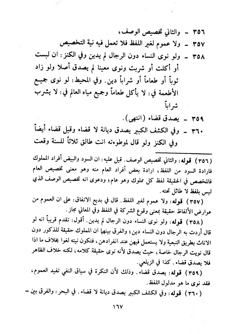 وَالثَّانِيَ تَخْصِيصُ الْوَصْفِ، 357 - وَلَا عُمُومَ لِغَيْرِ اللَّفْظِ، فَلَا تَعْمَلُ فِيهِ نِيَّةُ التَّخْصِيصِ 358 - وَلَوْ نَوَى النِّسَاءَ دُونَ الرِّجَالِ لَمْ يُدَيَّنْ وَفِي الْكَنْزِ: إنْ لَبِسْت، أَوْ أَكَلْت، أَوْ شَرِبْتُ وَنَوَى مُعَيَّنًا لَمْ يُصَدَّقْ أَصْلًا وَلَوْ زَادَ ثَوْبًا، أَوْ طَعَامًا، أَوْ شَرَابًا دُيِّنَ، وَفِي الْمُحِيطِ: لَوْ نَوَى جَمِيعَ الْأَطْعِمَةِ فِي لَا يَأْكُلُ طَعَامًا وَجَمِيعَ مِيَاهِ الْعَالَمِ فِي: لَا يُشْرِبُ شَرَابًا 359 - يُصَدَّقُ قَضَاءً (انْتَهَى) 360 - وَفِي الْكَشْفِ الْكَبِيرِ يُصَدَّقُ دَيَّانَةً لَا قَضَاءً وَقِيلَ قَضَاءً أَيْضًا.