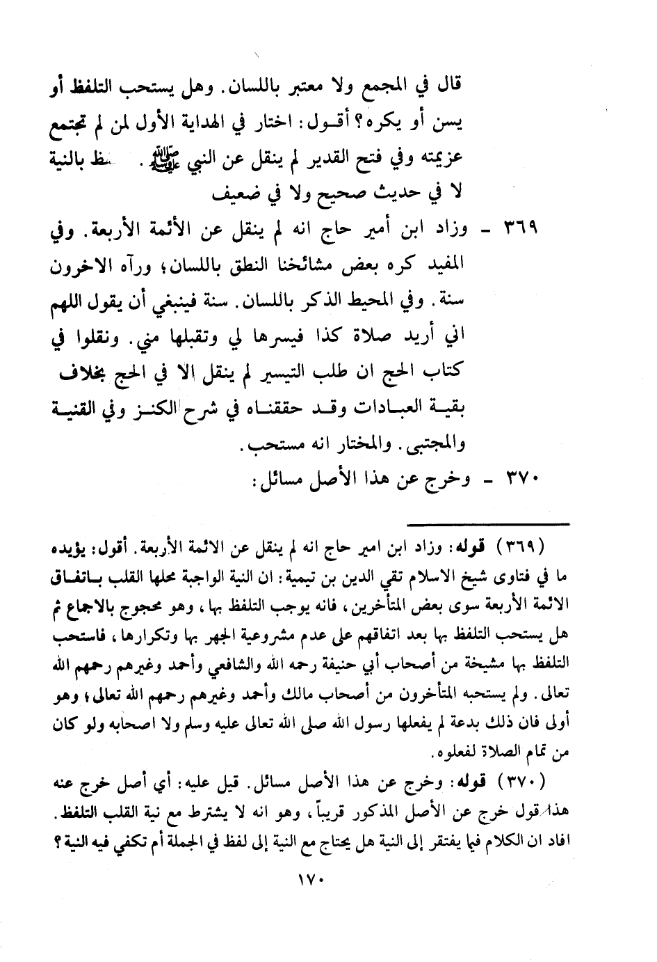 قَوْلُهُ: وَزَادَ ابْنُ أَمِيرِ الْحَاجِّ أَنَّهُ لَمْ يُنْقَلُ عَنْ الْأَئِمَّةِ الْأَرْبَعَةِ. أَقُولُ: يُؤَيِّدُهُ مَا فِي فَتَاوَى شَيْخِ الْإِسْلَامِ تَقِيِّ الدِّينِ بْنِ تَيْمِيَّةَ: أَنَّ النِّيَّةَ الْوَاجِبَةَ مَحَلُّهَا الْقَلْبُ بِاتِّفَاقِ الْأَئِمَّةِ الْأَرْبَعَةِ سِوَى بَعْضِ الْمُتَأَخِّرِينَ، فَإِنَّهُ يُوجِبُ التَّلَفُّظَ بِهَا، وَهُوَ مَحْجُوجٌ بِالْإِجْمَاعِ، ثُمَّ هَلْ يُسْتَحَبُّ التَّلَفُّظُ بِهَا بَعْدَ اتِّفَاقِهِمْ عَلَى عَدَمِ مَشْرُوعِيَّةِ الْجَهْرِ بِهَا وَتَكْرَارِهَا؟ فَاسْتَحَبَّ التَّلَفُّظَ بِهَا مَشْيَخَةٌ مِنْ أَصْحَابِ أَبِي حَنِيفَةَ - رَحِمَهُ اللَّهُ - وَالشَّافِعِيِّ وَأَحْمَدَ وَغَيْرِهِمْ رَحِمَهُمْ اللَّهُ تَعَالَى، وَلَمْ يَسْتَحِبَّهُ الْمُتَأَخِّرُونَ مِنْ أَصْحَابِ مَالِكٍ وَأَحْمَدَ وَغَيْرِهِمْ رَحِمَهُمْ اللَّهُ تَعَالَى، وَهُوَ أَوْلَى فَإِنَّ ذَلِكَ بِدْعَةٌ لَمْ يَفْعَلْهَا رَسُولُ اللَّهِ صَلَّى اللَّهُ تَعَالَى عَلَيْهِ وَسَلَّمَ وَلَا أَصْحَابُهُ، وَلَوْ كَانَ مِنْ تَمَامِ الصَّلَاةِ لَفَعَلُوهُ