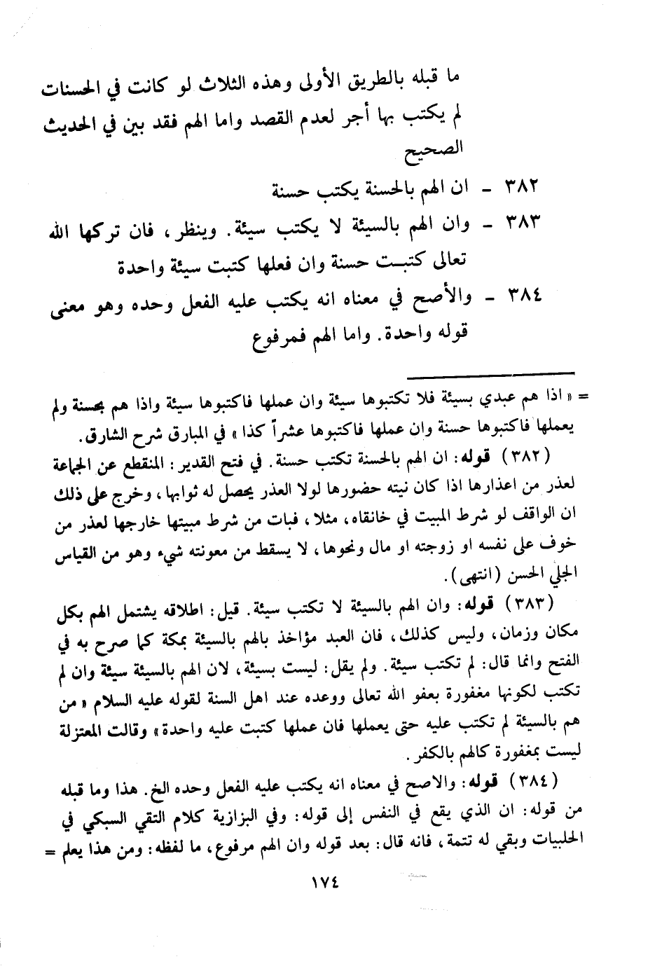 مَا قَبْلَهُ بِالطَّرِيقِ الْأَوْلَى وَهَذِهِ الثَّلَاثُ لَوْ كَانَتْ فِي الْحَسَنَاتِ لَمْ يُكْتَبْ بِهَا أَجْرٌ لِعَدَمِ الْقَصْدِ، وَأَمَّا الْهَمُّ فَقَدْ بُيِّنَ فِي الْحَدِيثِ الصَّحِيحِ 382 - أَنَّ الْهَمَّ بِالْحَسَنَةِ يُكْتَبُ حَسَنَةً 383 - وَأَنَّ الْهَمَّ بِالسَّيِّئَةِ لَا يُكْتَبُ سَيِّئَةً، وَيُنْظَرُ، فَإِنْ تَرَكَهَا لِلَّهِ تَعَالَى كُتِبَتْ حَسَنَةً، وَإِنْ فَعَلَهَا كُتِبَتْ سَيِّئَةً وَاحِدَةً 384 -، وَالْأَصَحُّ فِي مَعْنَاهُ أَنَّهُ يُكْتَبُ عَلَيْهِ الْفِعْلُ وَحْدَهُ، وَهُوَ مَعْنَى قَوْلِهِ: وَاحِدَةً، وَأَمَّا الْهَمُّ فَمَرْفُوعٌ