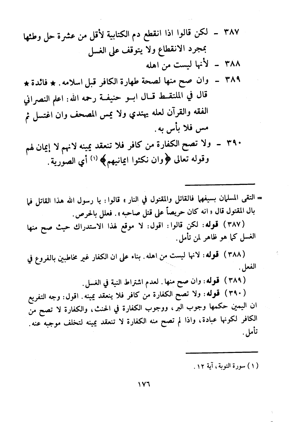 لَكِنْ: قَالُوا إذَا انْقَطَعَ دَمُ الْكِتَابِيَّةِ لِأَقَلَّ مِنْ عَشَرَةٍ حَلَّ وَطْؤُهَا بِمُجَرَّدِ الِانْقِطَاعِ وَلَا يَتَوَقَّفُ عَلَى الْغُسْلِ 388 -؛ لِأَنَّهَا لَيْسَتْ مِنْ أَهْلِهِ 389 - وَإِنْ صَحَّ مِنْهَا لِصِحَّةِ طَهَارَةِ الْكَافِرِ قَبْلَ إسْلَامِهِ. فَائِدَةٌ قَالَ فِي الْمُلْتَقَطِ: قَالَ أَبُو حَنِيفَةَ - رَحِمَهُ اللَّهُ -: أَعْلِمْ النَّصْرَانِيَّ الْفِقْهَ، وَالْقُرْآنَ لَعَلَّهُ يَهْتَدِي وَلَا يَمَسُّ الْمُصْحَفَ، وَإِنْ اغْتَسَلَ، ثُمَّ مَسَّ فَلَا بَأْسَ بِهِ، 390 - وَلَا تَصِحُّ الْكَفَّارَةُ مِنْ كَافِرٍ فَلَا تَنْعَقِدُ يَمِينُهُ؛ لِأَنَّهُمْ لَا أَيْمَانَ لَهُمْ وقَوْله تَعَالَى {وَإِنْ نَكَثُوا أَيْمَانَهُمْ} [التوبة: 12] أَيْ الصُّورِيَّةَ.