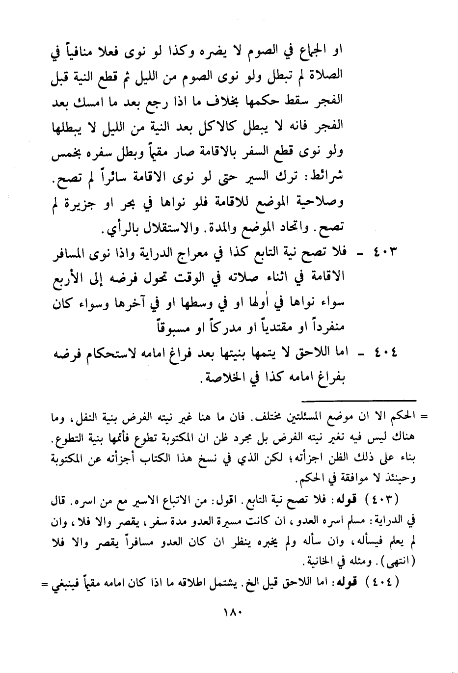 403 - فَلَا تَصِحُّ نِيَّةُ التَّابِعِ كَذَا فِي مِعْرَاجِ الدِّرَايَةِ، وَإِذَا نَوَى الْمُسَافِرُ الْإِقَامَةَ فِي أَثْنَاءِ صَلَاتِهِ فِي الْوَقْتِ تَحَوَّلَ فَرْضُهُ إلَى الْأَرْبَعِ سَوَاءٌ نَوَاهَا فِي أَوَّلِهَا، أَوْ فِي وَسَطِهَا، أَوْ فِي آخِرِهَا وَسَوَاءٌ كَانَ مُنْفَرِدًا، أَوْ مُقْتَدِيًا، أَوْ مُدْرِكًا، أَوْ مَسْبُوقًا 404 - أَمَّا اللَّاحِقُ لَا يُتِمُّهَا بِنِيَّتِهَا بَعْدَ فَرَاغِ إمَامِهِ لِاسْتِحْكَامِ فَرْضِهِ بِفَرَاغِ إمَامِهِ كَذَا فِي الْخُلَاصَةِ.