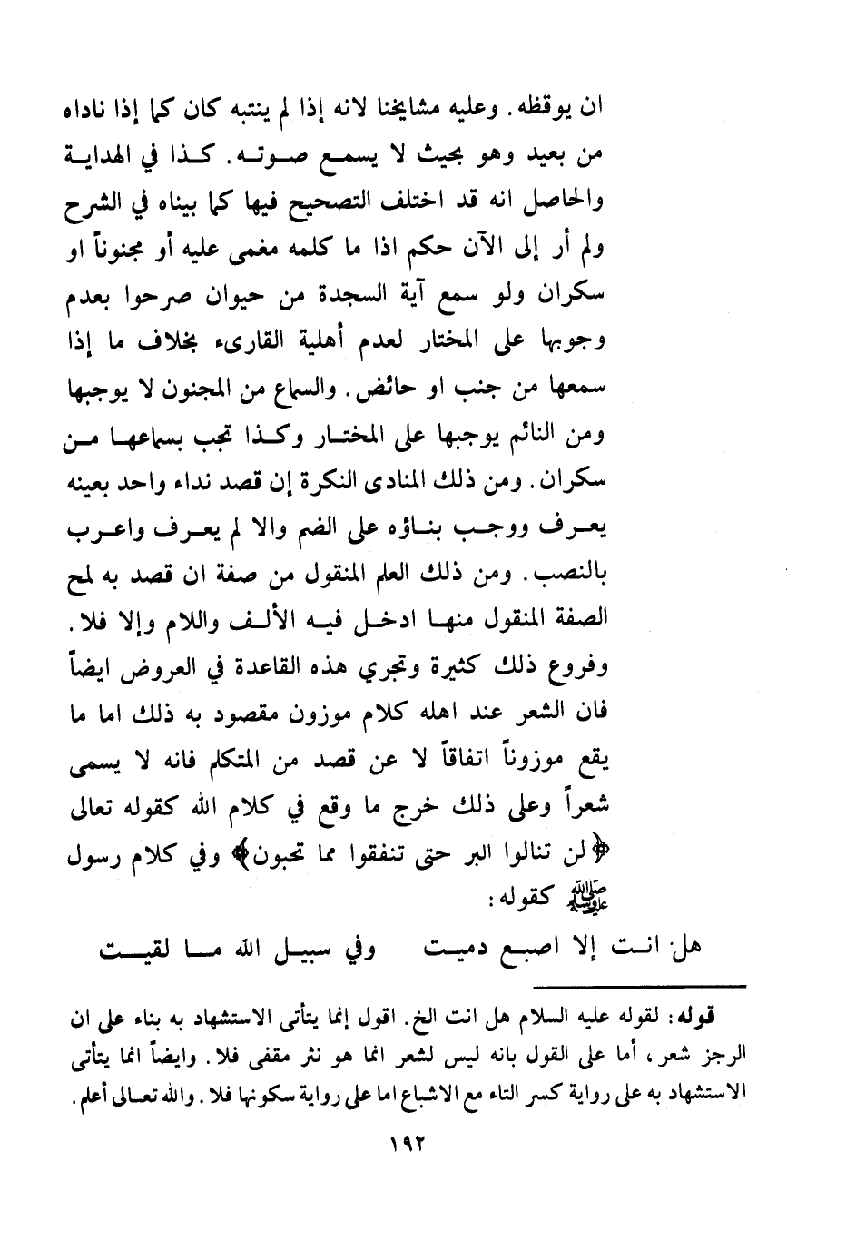 ـــــــــــــــــــــــــــــQقَوْلُهُ: لِقَوْلِهِ - عَلَيْهِ السَّلَامُ - هَلْ أَنْتَ إلَخْ، أَقُولُ إنَّمَا يَتَأَتَّى الِاسْتِشْهَادُ بِهِ بِنَاءً عَلَى أَنَّ الرَّجَزَ شِعْرٌ، أَمَّا عَلَى الْقَوْلِ بِأَنَّهُ لَيْسَ بِشِعْرٍ إنَّمَا هُوَ نَثْرٌ مُقَفًّى فَلَا، وَأَيْضًا إنَّمَا يَتَأَتَّى الِاسْتِشْهَادُ بِهِ عَلَى رِوَايَةِ كَسْرِ التَّاءِ مَعَ الْإِشْبَاعِ، أَمَّا عَلَى رِوَايَةِ سُكُونِهَا فَلَا، وَاَللَّهُ تَعَالَى أَعْلَمُ