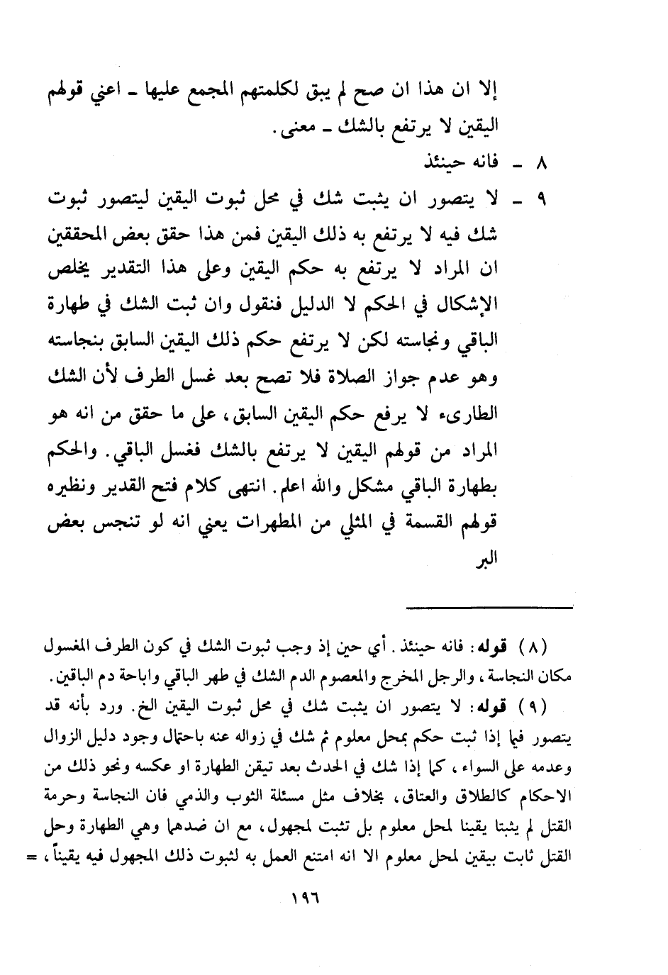 إلَّا أَنَّ هَذَا إنْ صَحَّ لَمْ يَبْقَ لِكَلِمَتِهِمْ الْمَجْمَعِ عَلَيْهَا - أَعْنِي قَوْلَهُمْ: الْيَقِينُ لَا يَرْتَفِعُ بِالشَّكِّ - مَعْنًى 8 - فَإِنَّهُ حِينَئِذٍ 9 - لَا يُتَصَوَّرُ أَنْ يَثْبُتَ شَكٌّ فِي مَحَلِّ ثُبُوتِ الْيَقِينِ لِيُتَصَوَّرَ ثُبُوتُ شَكٍّ فِيهِ لَا يَرْتَفِعُ بِهِ ذَلِكَ الْيَقِينُ، فَمِنْ هَذَا حَقَّقَ بَعْضُ الْمُحَقِّقِينَ أَنَّ الْمُرَادَ لَا يَرْتَفِعُ بِهِ حُكْمُ الْيَقِينِ، وَعَلَى هَذَا التَّقْدِيرِ يَخْلُصُ الْإِشْكَالُ فِي الْحُكْمِ لَا الدَّلِيلِ فَنَقُولُ: وَإِنْ ثَبَتَ الشَّكُّ فِي طَهَارَةِ الْبَاقِي وَنَجَاسَتِهِ لَكِنْ لَا يَرْتَفِعُ حُكْمُ ذَلِكَ الْيَقِينِ السَّابِقِ بِنَجَاسَتِهِ، وَهُوَ عَدَمُ جَوَازِ الصَّلَاةِ، فَلَا تَصِحُّ بَعْدَ غَسْلِ الطَّرَفِ؛ لِأَنَّ الشَّكَّ الطَّارِئَ لَا يَرْفَعُ حُكْمَ الْيَقِينِ السَّابِقِ، عَلَى مَا حُقِّقَ مِنْ أَنَّهُ هُوَ الْمُرَادُ مِنْ قَوْلِهِمْ: الْيَقِينُ لَا يَرْتَفِعُ بِالشَّكِّ فَغَسْلُ الْبَاقِي، وَالْحُكْمُ بِطَهَارَةِ الْبَاقِي مُشْكِلٌ، وَاَللَّهُ أَعْلَمُ. انْتَهَى كَلَامُ فَتْحِ الْقَدِيرِ.