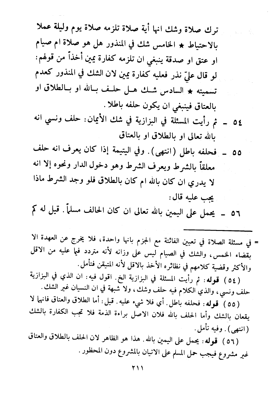 (54) قَوْلُهُ: ثُمَّ رَأَيْت الْمَسْأَلَةَ فِي الْبَزَّازِيَّةِ إلَخْ. أَقُولُ فِيهِ: إنَّ الَّذِي فِي الْبَزَّازِيَّةِ حَلَفَ وَنَسِيَ، وَاَلَّذِي الْكَلَامُ فِيهِ حَلَفَ وَشَكَّ، وَلَا شُبْهَةَ فِي أَنَّ النِّسْيَانَ غَيْرُ الشَّكِّ. (55) قَوْلُهُ: فَحَلِفُهُ بَاطِلٌ أَيْ فَلَا شَيْءَ عَلَيْهِ، قِيلَ: أَمَّا الطَّلَاقُ وَالْعَتَاقُ فَإِنَّهُمَا لَا يَقَعَانِ بِالشَّكِّ وَأَمَّا الْحَلِفُ بِاَللَّهِ؛ فَلِأَنَّ الْأَصْلَ بَرَاءَةُ الذِّمَّةِ فَلَا تَجِبُ الْكَفَّارَةُ بِالشَّكِّ (انْتَهَى) ، وَفِيهِ تَأَمُّلٌ. (56) قَوْلُهُ: يَحْمِلُ عَلَى الْيَمِينِ بِاَللَّهِ، هَذَا هُوَ الظَّاهِرُ؛ لِأَنَّ الْحَلِفَ بِالطَّلَاقِ، وَالْعَتَاقِ غَيْرُ مَشْرُوعٍ فَيَجِبُ حَمْلُ الْمُسْلِمِ عَلَى الْإِتْيَانِ بِالْمَشْرُوعِ دُونَ الْمَحْظُورِ.