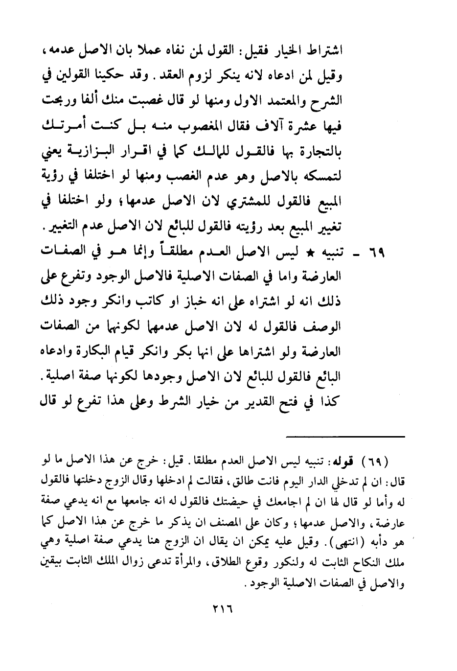 69 - تَنْبِيهٌ لَيْسَ الْأَصْلُ الْعَدَمَ مُطْلَقًا، وَإِنَّمَا هُوَ فِي الصِّفَاتِ الْعَارِضَةِ وَأَمَّا فِي الصِّفَاتِ الْأَصْلِيَّةِ فَالْأَصْلُ الْوُجُودُ وَتَفَرَّعَ عَلَى ذَلِكَ أَنَّهُ لَوْ اشْتَرَاهُ عَلَى أَنَّهُ خَبَّازٌ، أَوْ كَاتِبٌ وَأَنْكَرَ وُجُودَ ذَلِكَ الْوَصْفِ فَالْقَوْلُ لَهُ؛ لِأَنَّ الْأَصْلَ عَدَمُهُمَا لِكَوْنِهِمَا مِنْ الصِّفَاتِ الْعَارِضَةِ.