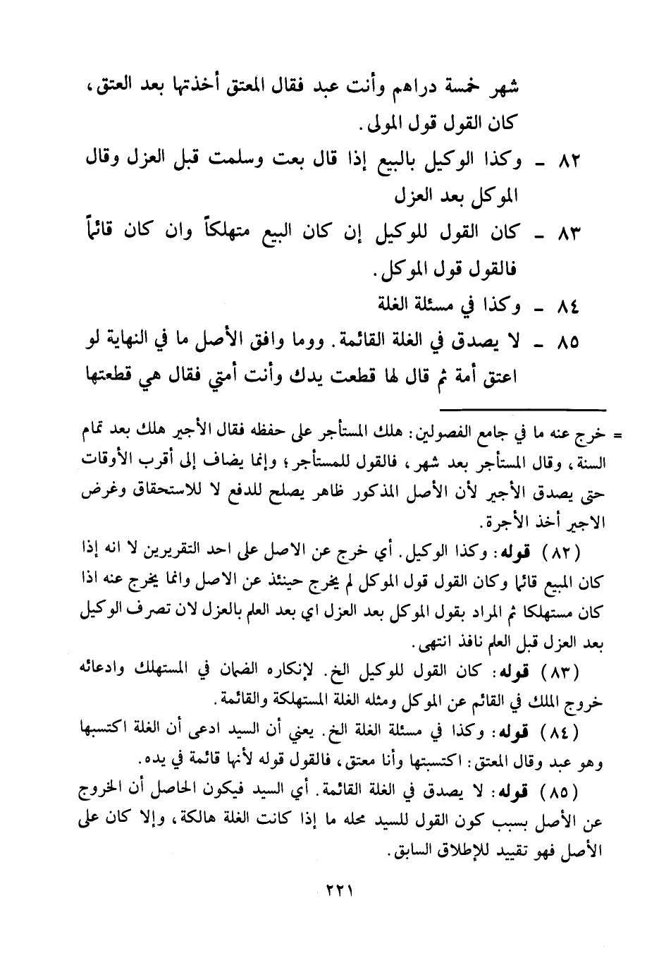 82 - وَكَذَا الْوَكِيلُ بِالْبَيْعِ إذَا قَالَ: بِعْت وَسَلَّمْت قَبْلَ الْعَزْلِ وَقَالَ الْمُوَكِّلُ: بَعْدَ الْعَزْلِ 83 - كَانَ الْقَوْلُ لِلْوَكِيلِ إنْ كَانَ الْبَيْعُ مُسْتَهْلَكًا، وَإِنْ كَانَ قَائِمًا فَالْقَوْلُ قَوْلُ الْمُوَكِّلِ.