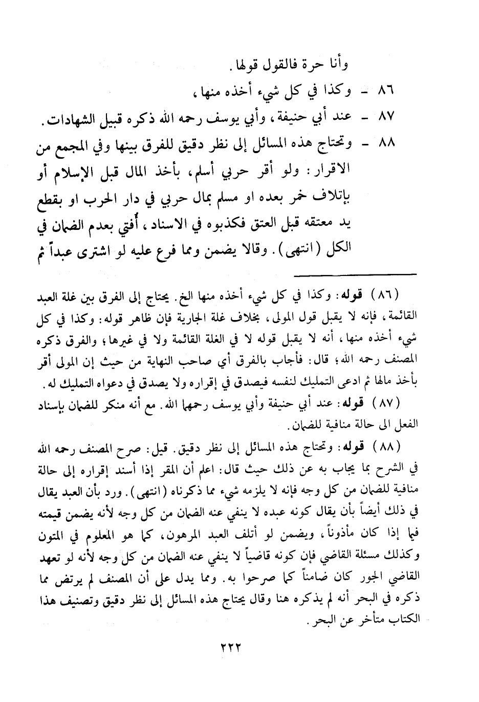 وَأَنَا حُرَّةٌ فَالْقَوْلُ قَوْلُهَا 86 - وَكَذَا فِي كُلِّ شَيْءٍ أَخَذَهُ مِنْهَا، 87 - عِنْدَ أَبِي حَنِيفَةَ، وَأَبِي يُوسُفَ - رَحِمَهُ اللَّهُ - ذَكَرَهُ قُبَيْلَ الشَّهَادَاتِ، 88 - وَتَحْتَاجُ هَذِهِ الْمَسَائِلُ إلَى نَظَرٍ دَقِيقٍ لِلْفَرْقِ بَيْنَهَا
