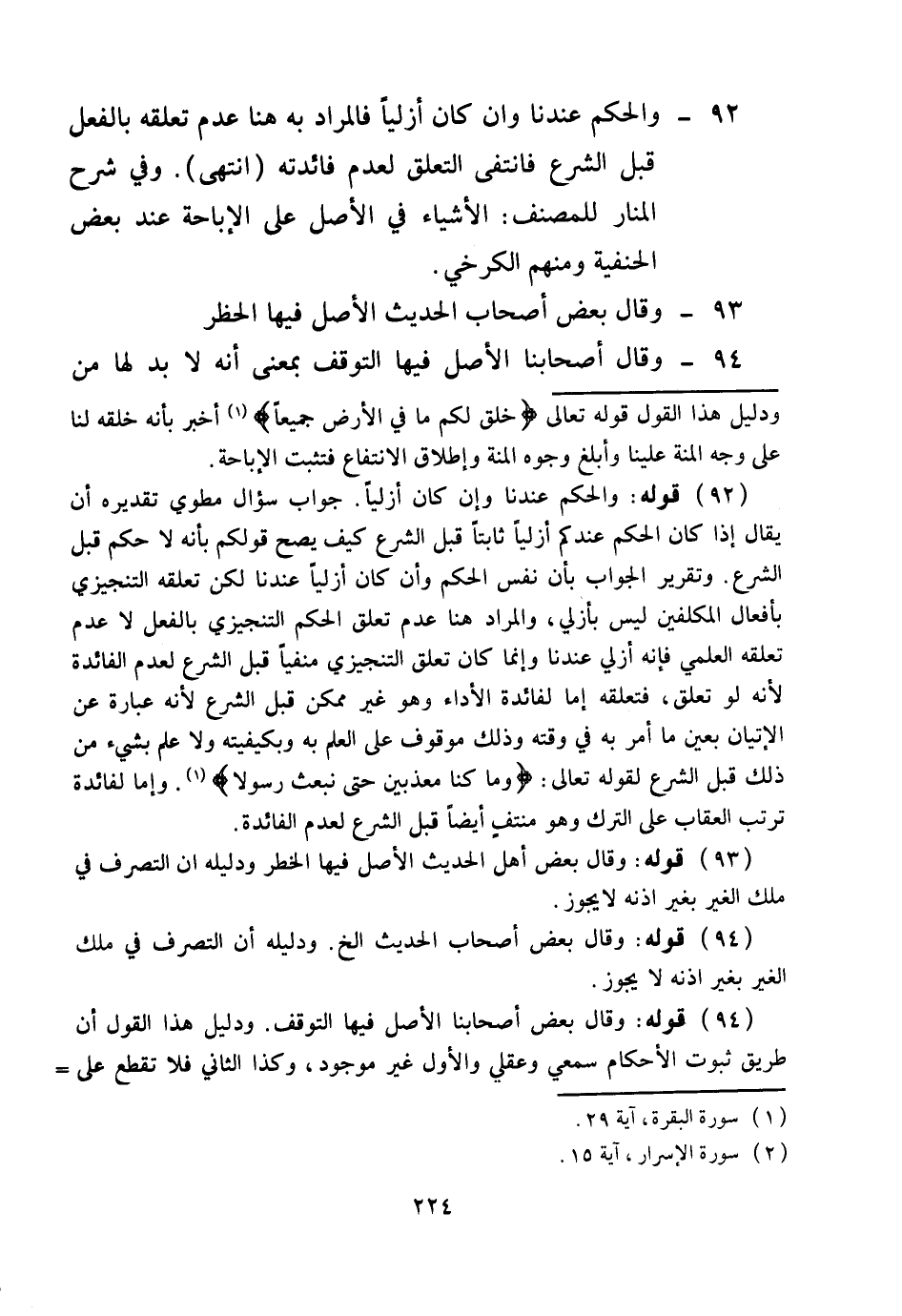(93) قَوْلُهُ: وَقَالَ بَعْضُ أَصْحَابِ الْحَدِيثِ: الْأَصْلُ فِيهَا الْحَظْرُ وَدَلِيلُهُ أَنَّ التَّصَرُّفَ فِي مِلْكِ الْغَيْرِ بِغَيْرِ إذْنِهِ لَا يَجُوزُ. (94) قَوْلُهُ: وَقَالَ بَعْضُ أَصْحَابِنَا: الْأَصْلُ فِيهَا التَّوَقُّفُ، وَدَلِيلُ هَذَا الْقَوْلِ أَنَّ طَرِيقَ ثُبُوتِ الْأَحْكَامِ سَمْعِيٌّ وَعَقْلِيٌّ، وَالْأَوَّلُ غَيْرُ مَوْجُودٍ، وَكَذَا الثَّانِي فَلَا تُقْطَعُ عَلَى