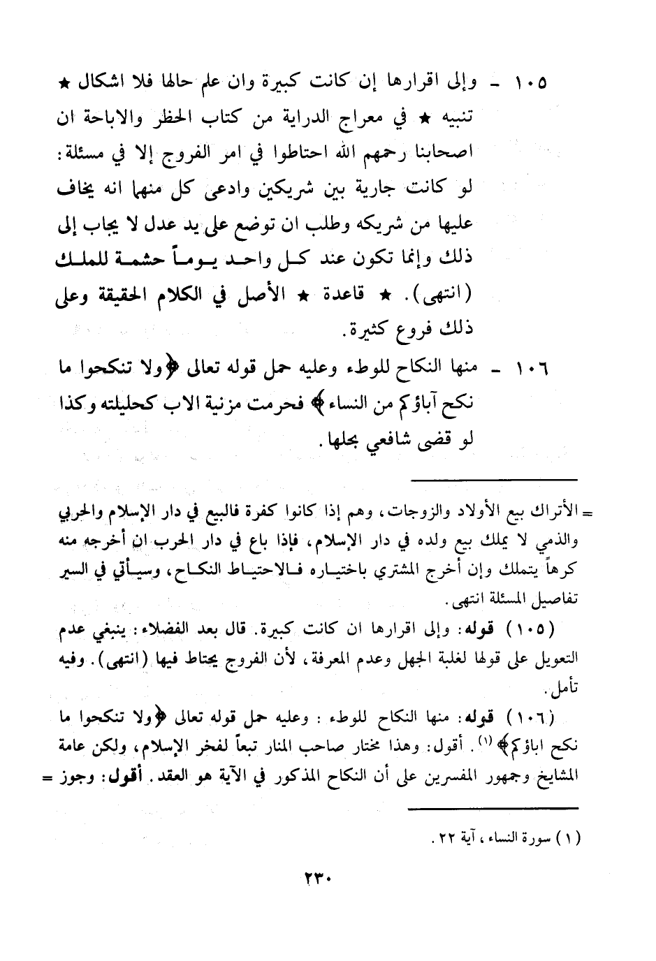 (106) قَوْلُهُ: مِنْهَا النِّكَاحُ لِلْوَطْءِ: وَعَلَيْهِ حُمِلَ قَوْله تَعَالَى {وَلا تَنْكِحُوا مَا نَكَحَ آبَاؤُكُمْ} [النساء: 22] أَقُولُ: وَهَذَا مُخْتَارُ صَاحِبِ الْمَنَارِ تَبَعًا لِفَخْرِ الْإِسْلَامِ، وَلَكِنَّ عَامَّةَ الْمَشَايِخِ وَجُمْهُورَ الْمُفَسِّرِينَ عَلَى أَنَّ النِّكَاحَ الْمَذْكُورَ فِي الْآيَةِ هُوَ الْعَقْدُ، أَقُولُ: وَجَوَّزَ