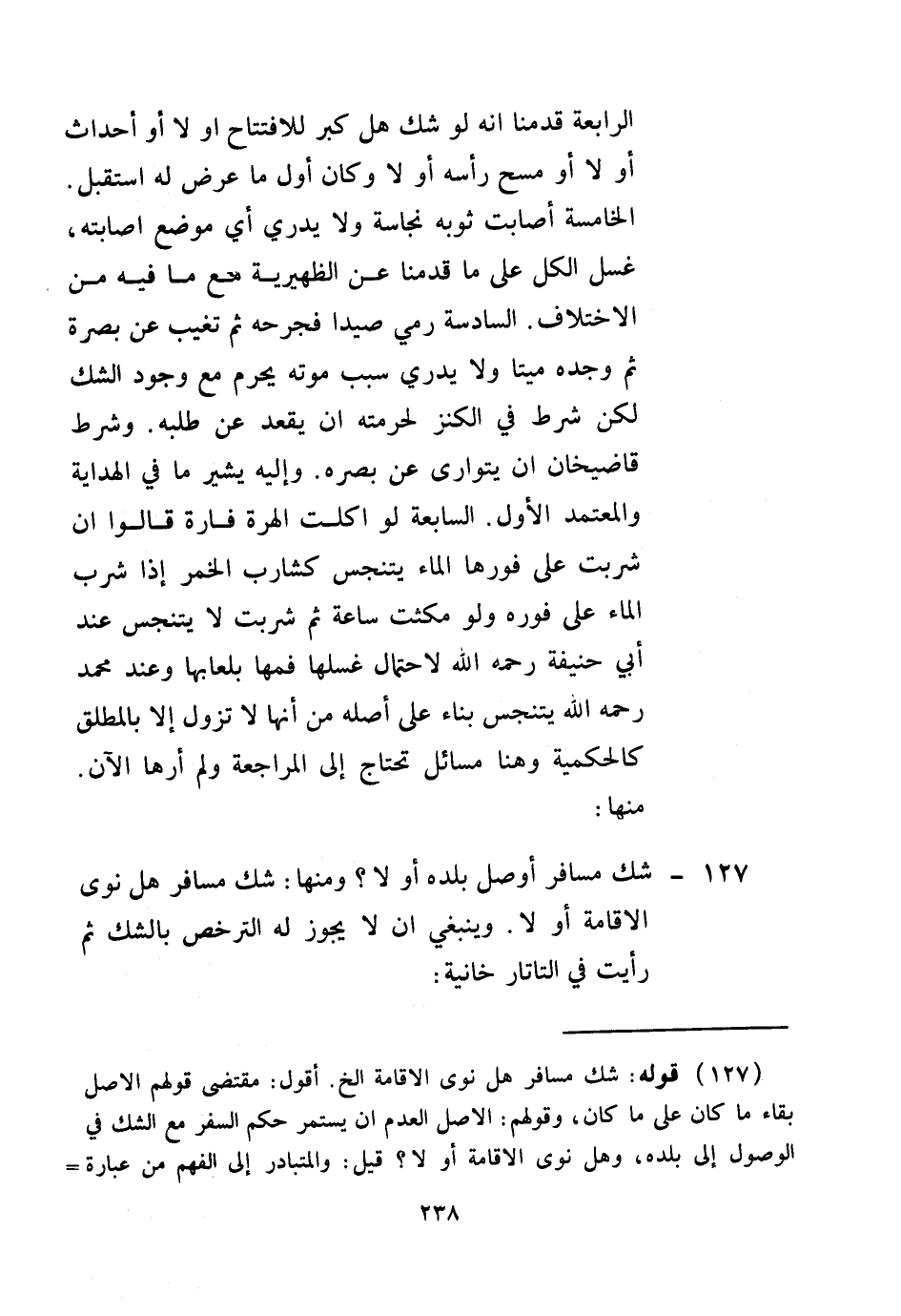 وَهُنَا مَسَائِلُ تَحْتَاجُ إلَى الْمُرَاجَعَةِ وَلَمْ أَرَهَا الْآنَ: مِنْهَا 127 - شَكَّ مُسَافِرٌ أَوَصَلَ بَلَدَهُ، أَوْ لَا؟ ، وَمِنْهَا: شَكَّ مُسَافِرٌ هَلْ نَوَى الْإِقَامَةَ، أَوْ لَا، وَيَنْبَغِي أَنْ لَا يَجُوزَ لَهُ التَّرَخُّصُ بِالشَّكِّ ثُمَّ رَأَيْت فِي التَّتَارْخَانِيَّة