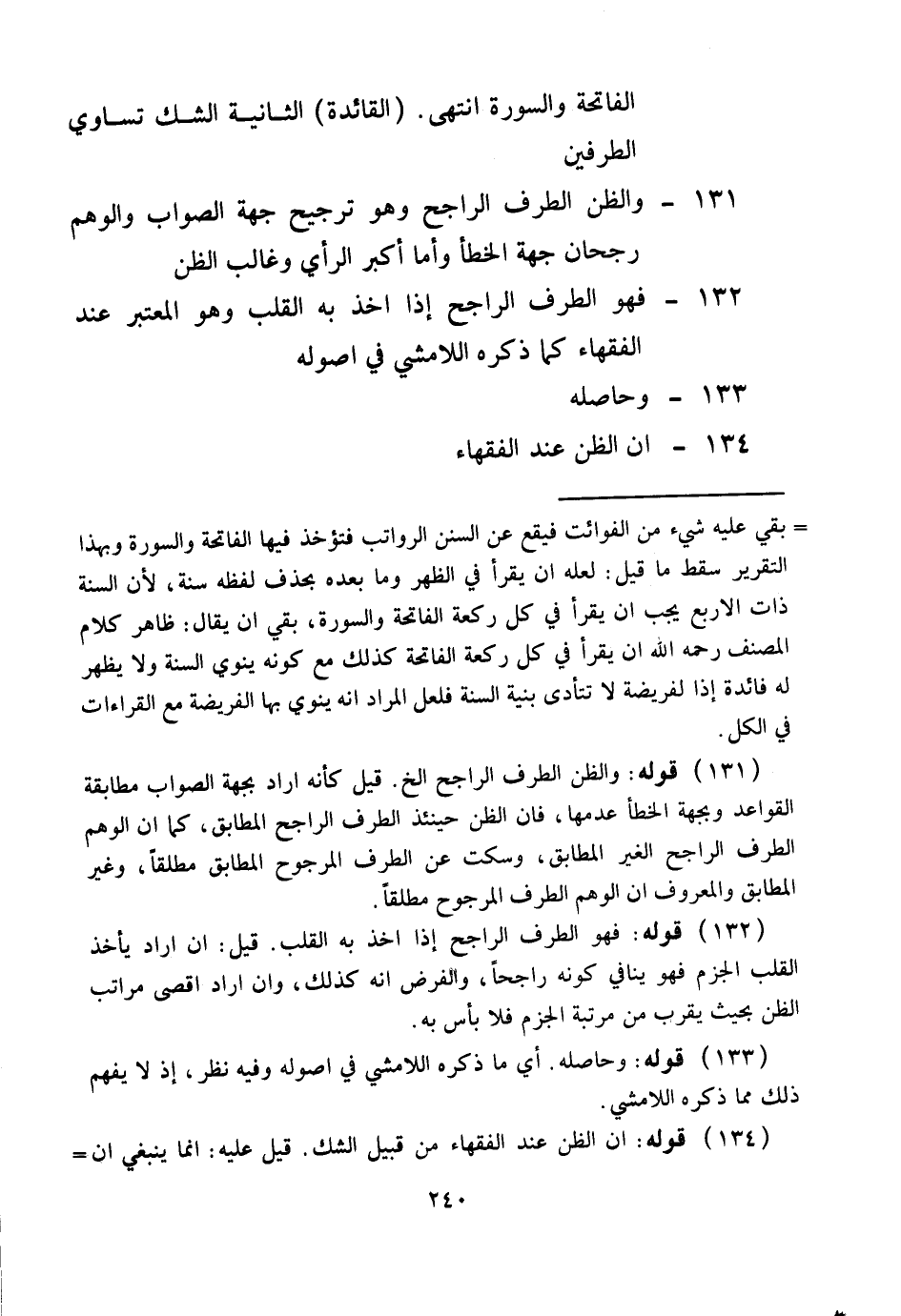 (133) قَوْلُهُ: وَحَاصِلُهُ، أَيْ مَا ذَكَرَهُ اللَّامِشِيُّ فِي أُصُولِهِ وَفِيهِ نَظَرٌ، إذْ لَا يُفْهَمُ ذَلِكَ مِمَّا ذَكَرَهُ اللَّامِشِيُّ (134) قَوْلُهُ: إنَّ الظَّنَّ عِنْدَ الْفُقَهَاءِ مِنْ قَبِيلِ الشَّكِّ. قِيلَ عَلَيْهِ: إنَّمَا يَنْبَغِي أَنْ