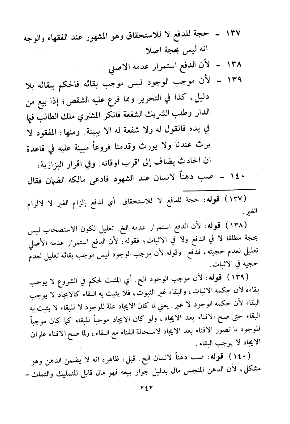 ـــــــــــــــــــــــــــــQقَوْلُهُ: حُجَّةٌ لِلدَّفْعِ لَا لِلِاسْتِحْقَاقِ أَيْ لِدَفْعِ إلْزَامِ الْغَيْرِ لَا لِإِلْزَامِ الْغَيْرِ. (138) قَوْلُهُ: لِأَنَّ الدَّفْعَ اسْتِمْرَارُ عَدَمِهِ إلَخْ تَعْلِيلٌ لِكَوْنِ الِاسْتِصْحَابِ لَيْسَ بِحُجَّةٍ مُطْلَقًا لَا فِي الدَّفْعِ وَلَا فِي الْإِثْبَاتِ، فَقَوْلُهُ: لِأَنَّ الدَّفْعَ اسْتِمْرَارُ عَدَمِهِ الْأَصْلِيِّ تَعْلِيلٌ لِعَدَمِ حُجِّيَّتِهِ، فِي الدَّفْعِ. وَقَوْلُهُ: لِأَنَّ مُوجِبَ الْوُجُودِ لَيْسَ مُوجِبَ بَقَائِهِ تَعْلِيلٌ لِعَدَمِ حُجِّيَّتِهِ فِي الْإِثْبَاتِ (139) قَوْلُهُ: لِأَنَّ مُوجِبَ الْوُجُودِ إلَخْ، أَيْ الْمُثْبِتُ لِحُكْمٍ فِي الشُّرُوعِ لَا يُوجِبُ بَقَاءَهُ؛ لِأَنَّ حُكْمَهُ الْإِثْبَاتُ، وَالْبَقَاءُ غَيْرُ الثُّبُوتِ، فَلَا يَثْبُتَ بِهِ الْبَقَاءُ كَالْإِيجَادِ لَا يُوجِبُ الْبَقَاءَ؛ لِأَنَّ حُكْمَهُ الْوُجُودُ لَا غَيْرُ، يَعْنِي لَمَّا كَانَ الْإِيجَادُ عِلَّةً لِلْوُجُودِ لَا لِلْبَقَاءِ لَا يَثْبُتُ بِهِ الْبَقَاءُ حَتَّى صَحَّ الْإِفْنَاءُ بَعْدَ الْإِيجَادِ، وَلَوْ كَانَ الْإِيجَادُ مُوجِبًا لِلْبَقَاءِ كَمَا كَانَ مُوجِبًا لِلْوُجُودِ لَمَّا تُصُوِّرَ الْإِفْنَاءُ بَعْدَ الْإِيجَادِ لِاسْتِحَالَةِ الْفَنَاءِ مَعَ الْبَقَاءِ، وَلَمَّا صَحَّ الْإِفْنَاءُ عُلِمَ أَنَّ الْإِيجَادَ لَا يُوجِبُ الْبَقَاءَ.