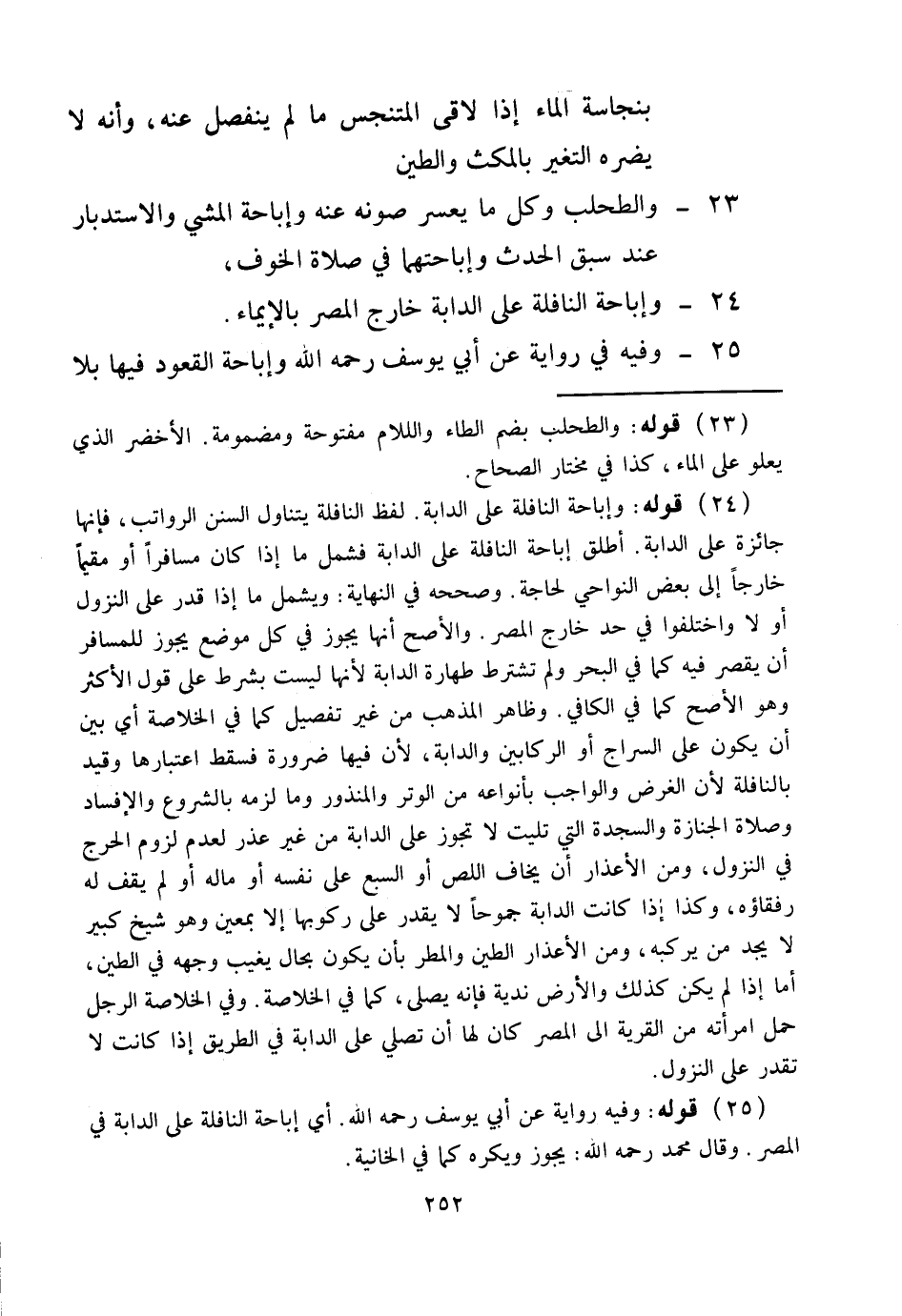 24 - وَإِبَاحَةُ النَّافِلَةِ عَلَى الدَّابَّةِ خَارِجَ الْمِصْرِ بِالْإِيمَاءِ. 25 - وَفِيهِ فِي رِوَايَةٍ عَنْ أَبِي يُوسُفَ - رَحِمَهُ اللَّهُ - وَإِبَاحَةُ الْقُعُودِ فِيهَا بِلَا