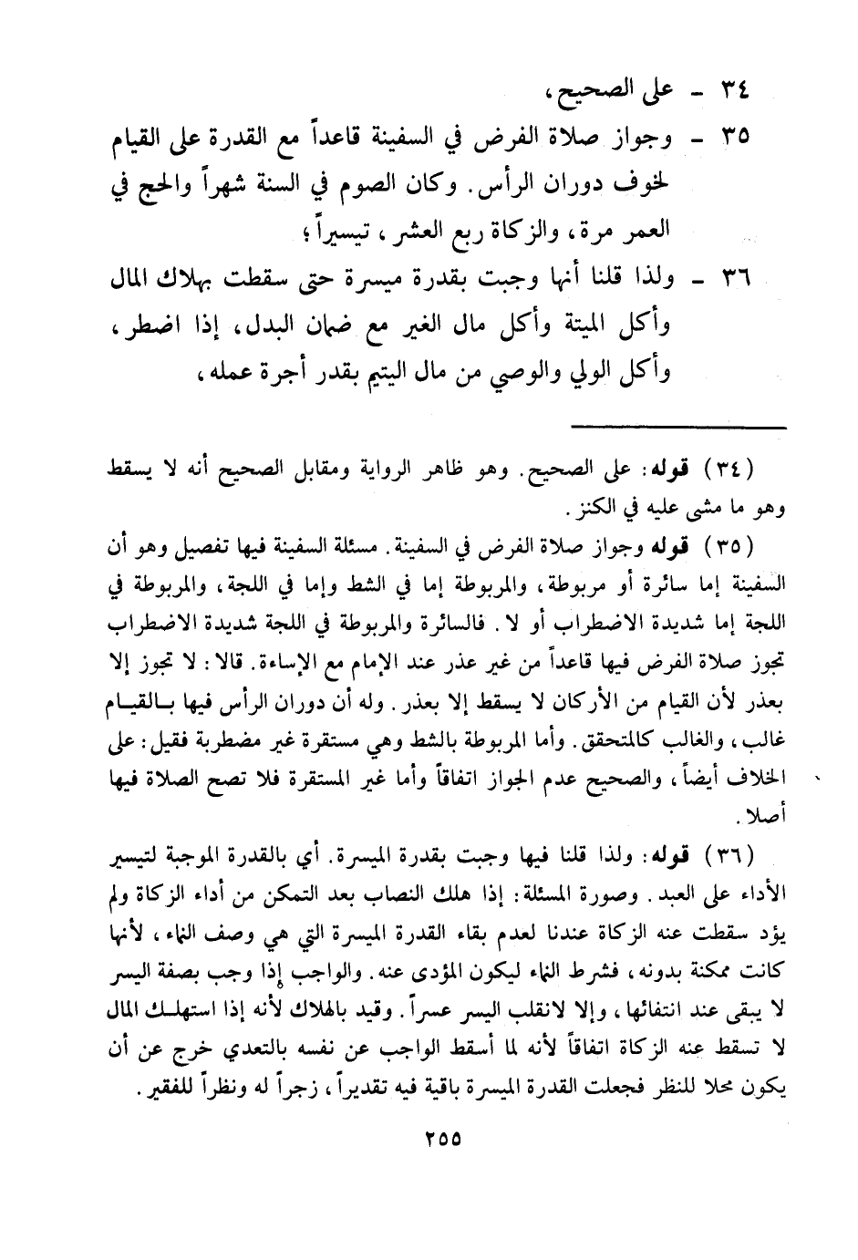 35 - وَجَوَازُ صَلَاةِ الْفَرْضِ فِي السَّفِينَةِ قَاعِدًا مَعَ الْقُدْرَةِ عَلَى الْقِيَامِ لِخَوْفِ دَوَرَانِ الرَّأْسِ. وَكَانَ الصَّوْمُ فِي السَّنَةِ شَهْرًا، وَالْحَجُّ فِي الْعُمْرِ مَرَّةً، وَالزَّكَاةُ رُبْعَ الْعَشْرِ، تَيْسِيرًا