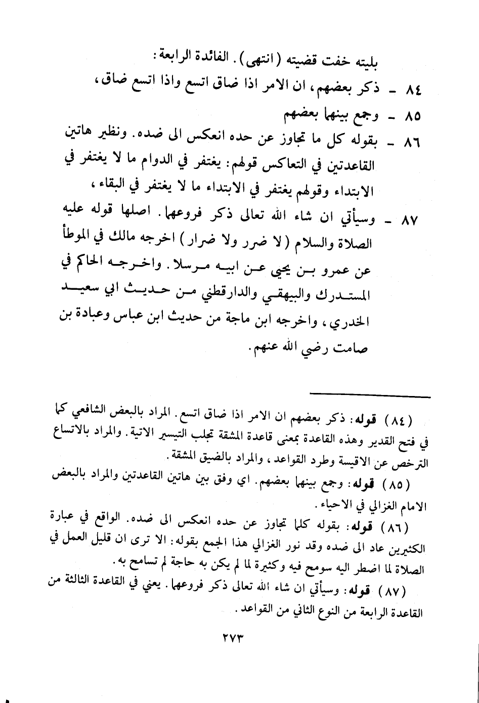 وَالْمُرَادُ بِالِاتِّسَاعِ التَّرَخُّصُ عَنْ الْأَقْيِسَةِ وَطَرْدِ الْقَوَاعِدِ، وَالْمُرَادُ بِالضِّيقِ الْمَشَقَّةُ (85) قَوْلُهُ: وَجَمَعَ بَيْنَهُمَا بَعْضُهُمْ، أَيْ وَفَّقَ بَيْنَ هَاتَيْنِ الْقَاعِدَتَيْنِ، وَالْمُرَادُ بِالْبَعْضِ الْإِمَامُ الْغَزَالِيُّ فِي الْإِحْيَاءِ (86)