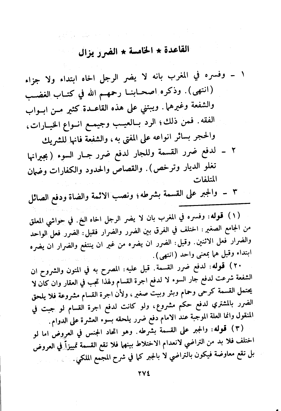 الْقَاعِدَةُ الْخَامِسَةُ الضَّرَرُ يُزَالُ 1 - وَفَسَّرَهُ فِي الْمُغْرِبِ بِأَنَّهُ لَا يَضُرُّ الرَّجُلُ أَخَاهُ ابْتِدَاءً وَلَا جَزَاءً (انْتَهَى) .