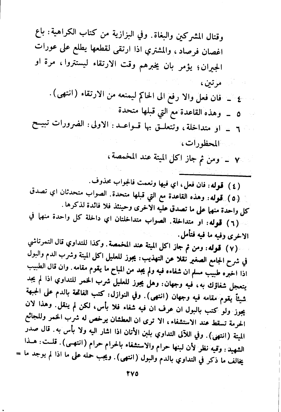 (7) قَوْلُهُ: وَمِنْ ثَمَّ جَازَ أَكْلُ الْمَيْتَةِ عِنْدَ الْمَخْمَصَةِ، وَكَذَا لِلتَّدَاوِي قَالَ التُّمُرْتَاشِيُّ فِي شَرْحِ الْجَامِعِ الصَّغِيرِ نَقْلًا عَنْ التَّهْذِيبِ: يَجُوزُ لِلْعَلِيلِ أَكْلُ الْمَيْتَةِ وَشُرْبُ الدَّمِ وَالْبَوْلِ إذَا أَخْبَرَهُ طَبِيبٌ مُسْلِمٌ أَنَّ شِفَاءَهُ فِيهِ، وَلَمْ يَجِدْ مِنْ الْمُبَاحِ مَا يَقُومُ مَقَامَهُ.