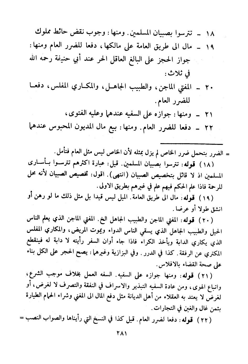 وَمِنْهَا: وُجُوبُ نَقْضِ حَائِطٍ مَمْلُوكٍ 19 - مَالَ إلَى طَرِيقِ الْعَامَّةِ عَلَى مَالِكِهَا؛ دَفْعًا لِلضَّرَرِ الْعَامِّ، وَمِنْهَا: جَوَازُ الْحَجْرِ عَلَى الْبَالِغِ الْعَاقِلِ الْحُرِّ عِنْدَ أَبِي حَنِيفَةَ - رَحِمَهُ اللَّهُ - فِي ثَلَاثٍ: 20 - الْمُفْتِي الْمَاجِنِ، وَالطَّبِيبِ الْجَاهِلِ، وَالْمُكَارِي الْمُفْلِسِ؛ دَفْعًا لِلضَّرَرِ الْعَامِّ 21 - وَمِنْهَا: جَوَازُهُ عَلَى السَّفِيهِ عِنْدَهُمَا وَعَلَيْهِ الْفَتْوَى، 22 - دَفْعًا لِلضَّرَرِ الْعَامِّ.