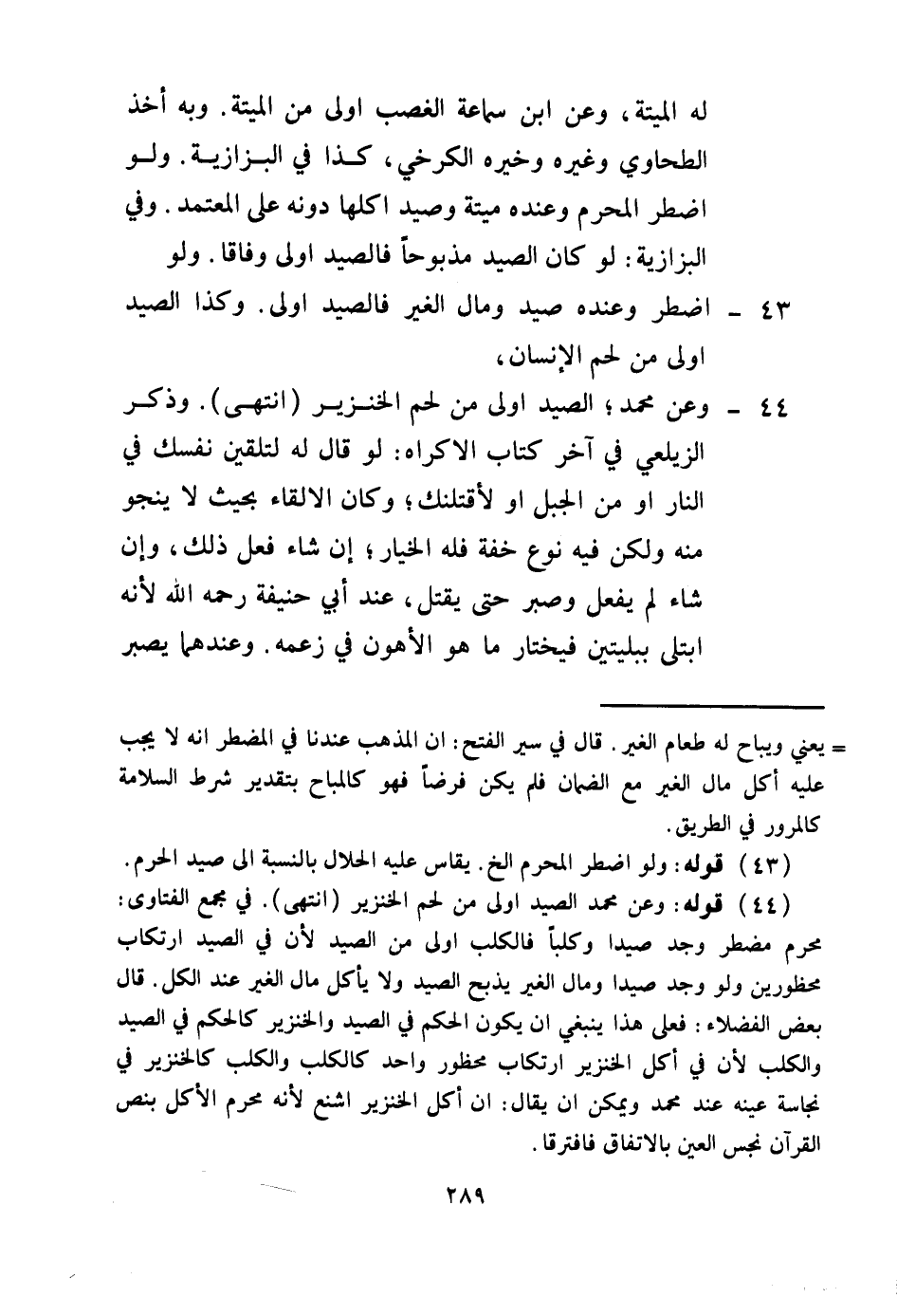 (43) . قَوْلُهُ: وَلَوْ اُضْطُرَّ الْمُحْرِمُ إلَخْ، يُقَاسُ عَلَيْهِ الْحَلَالُ بِالنِّسْبَةِ إلَى صَيْدِ الْحَرَمِ (44) قَوْلُهُ: وَعَنْ مُحَمَّدٍ الصَّيْدُ أَوْلَى مِنْ لَحْمِ الْخِنْزِيرِ (انْتَهَى) .