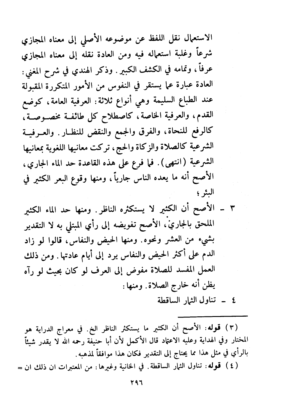 وَذَكَرَ الْهِنْدِيُّ فِي شَرْحِ الْمُغْنِي: الْعَادَةُ عِبَارَةٌ عَمَّا يَسْتَقِرُّ فِي النُّفُوسِ مِنْ الْأُمُورِ الْمُتَكَرِّرَةِ الْمَقْبُولَةِ عِنْدَ الطِّبَاعِ السَّلِيمَةِ، وَهِيَ أَنْوَاعٌ ثَلَاثَةٌ: الْعُرْفِيَّةُ الْعَامَّةُ، كَوَضْعِ الْقَدَمِ، وَالْعُرْفِيَّةُ الْخَاصَّةُ: كَاصْطِلَاحِ كُلِّ طَائِفَةٍ مَخْصُوصَةٍ، كَالرَّفْعِ لِلنُّحَاةِ، وَالْفَرْقِ وَالْجَمْعِ وَالنَّقْضِ لِلنُّظَّارِ. وَالْعُرْفِيَّةُ الشَّرْعِيَّةُ: كَالصَّلَاةِ وَالزَّكَاةِ وَالْحَجِّ، تُرِكَتْ مَعَانِيهَا اللُّغَوِيَّةُ بِمَعَانِيهَا الشَّرْعِيَّةِ (انْتَهَى) .