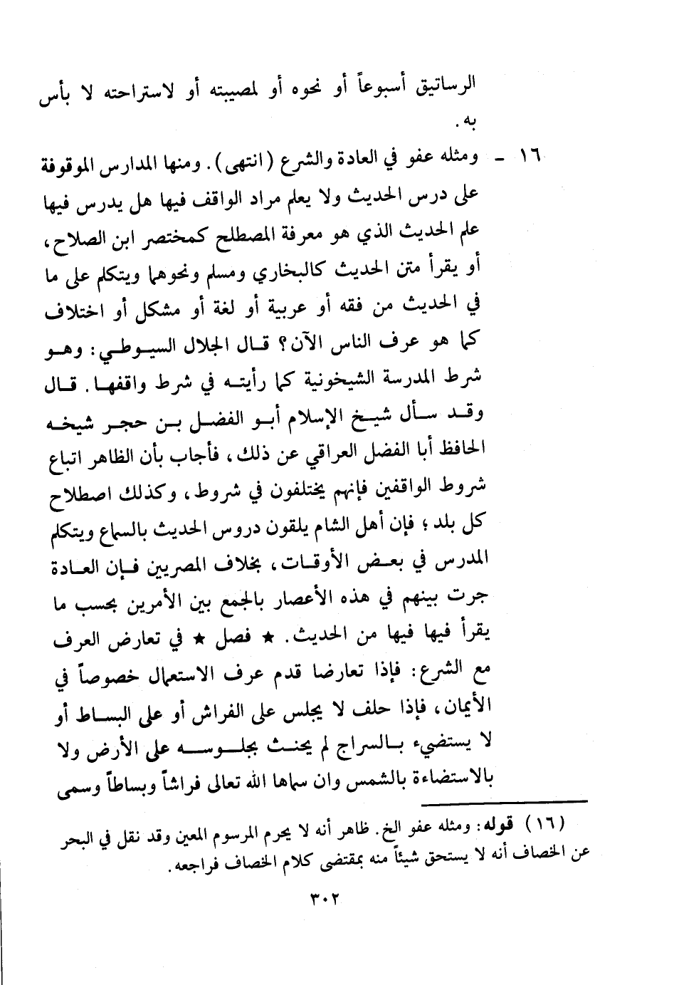 وَمِنْهَا الْمَدَارِسُ الْمَوْقُوفَةُ عَلَى دَرْسِ الْحَدِيثِ، وَلَا يُعْلَمُ مُرَادُ الْوَاقِفِ فِيهَا هَلْ يُدَرَّسُ فِيهَا عِلْمُ الْحَدِيثِ الَّذِي هُوَ مَعْرِفَةُ الْمُصْطَلَحِ كَمُخْتَصَرِ ابْنِ الصَّلَاحِ؟ أَوْ يُقْرَأُ مَتْنُ الْحَدِيثِ كَالْبُخَارِيِّ وَمُسْلِمٍ وَنَحْوِهِمَا، وَيُتَكَلَّمُ عَلَى مَا فِي الْحَدِيثِ مِنْ فِقْهٍ أَوْ عَرَبِيَّةٍ أَوْ لُغَةٍ أَوْ مُشْكِلٍ أَوْ اخْتِلَافٍ كَمَا هُوَ عُرْفُ النَّاسِ الْآنَ؟ قَالَ الْجَلَالُ السُّيُوطِيّ: وَهُوَ شَرْطُ الْمَدْرَسَةِ الشَّيْخُونِيَّةِ كَمَا رَأَيْته فِي شَرْطِ وَاقِفِهَا.