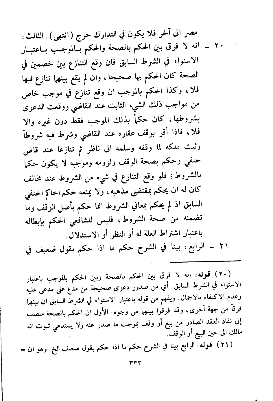 أَنَّهُ لَا فَرْقَ بَيْنَ الْحُكْمِ بِالصِّحَّةِ، وَالْحُكْمِ بِالْمُوجِبِ بِاعْتِبَارِ الِاسْتِوَاءِ فِي الشَّرْطِ السَّابِقِ فَإِنْ وَقَعَ التَّنَازُعُ بَيْنَ خَصْمَيْنِ فِي الصِّحَّةِ كَانَ الْحُكْمُ بِهَا صَحِيحًا، وَإِنْ لَمْ يَقَعْ بَيْنَهُمَا تَنَازُعٌ فِيهَا فَلَا، وَكَذَا الْحُكْمُ بِالْمُوجِبِ إنْ وَقَعَ تَنَازُعٌ فِي مُوجِبٍ خَاصٍّ مِنْ مَوَاجِبِ ذَلِكَ الشَّيْءِ الثَّابِتِ عِنْدَ الْقَاضِي وَوَقَعَتْ الدَّعْوَى بِشُرُوطِهَا، كَانَ حُكْمًا بِذَلِكَ الْمُوجِبِ فَقَطْ دُونَ غَيْرِهِ، وَإِلَّا فَلَا، فَإِذَا أَقَرَّ بِوَقْفِ عَقَارِهِ عِنْدَ الْقَاضِي، وَشَرَطَ فِيهِ شُرُوطًا وَثَبَتَ مِلْكُهُ لِمَا وَقَفَهُ وَسَلَّمَهُ إلَى نَاظِرٍ ثُمَّ تَنَازَعَا عِنْدَ قَاضٍ حَنَفِيٍّ، وَحَكَمَ بِصِحَّةِ الْوَقْفِ وَلُزُومِهِ وَمُوجِبِهِ لَا يَكُونُ حُكْمًا بِالشُّرُوطِ؛ فَلَوْ وَقَعَ التَّنَازُعُ فِي شَيْءٍ مِنْ الشُّرُوطِ عِنْدَ مُخَالِفٍ كَانَ لَهُ أَنْ يَحْكُمَ بِمُقْتَضَى مَذْهَبِهِ، وَلَا يَمْنَعُهُ حُكْمُ الْحَاكِمِ الْحَنَفِيِّ السَّابِقِ إذْ لَمْ يَحْكُمْ بِمَعَانِي الشُّرُوطِ إنَّمَا حَكَمَ بِأَصْلِ الْوَقْفِ، وَمَا تَضَمَّنَهُ مِنْ صِحَّةِ الشُّرُوطِ، فَلَيْسَ لِلشَّافِعِيِّ الْحُكْمُ بِإِبْطَالِهِ بِاعْتِبَارِ اشْتِرَاطِ الْعِلَّةِ لَهُ أَوْ النَّظَرِ أَوْ الِاسْتِدْلَالِ.