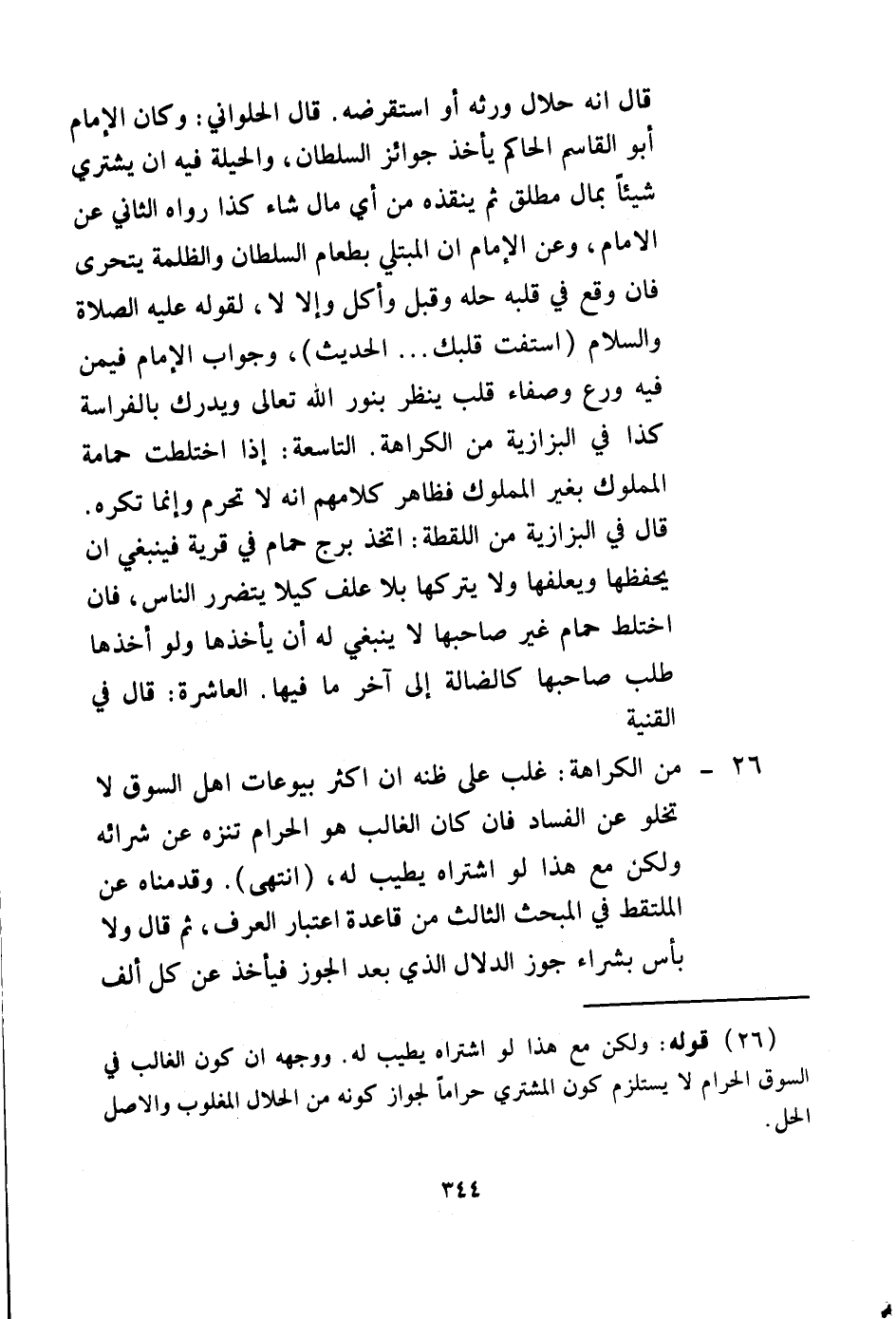 الْعَاشِرَةُ: قَالَ فِي الْقُنْيَةِ 26 - مِنْ الْكَرَاهَةِ: غَلَبَ عَلَى ظَنِّهِ أَنَّ أَكْثَرَ بُيُوعَاتِ أَهْلِ السُّوقِ لَا تَخْلُو عَنْ الْفَسَادِ فَإِنْ كَانَ الْغَالِبُ هُوَ الْحَرَامَ تَنَزَّهَ عَنْ شِرَائِهِ، وَلَكِنْ مَعَ هَذَا لَوْ اشْتَرَاهُ يَطِيبُ لَهُ، (انْتَهَى) .