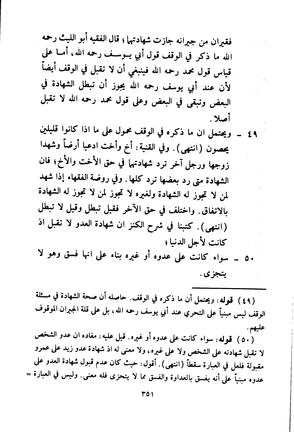 (50) قَوْلُهُ: سَوَاءٌ كَانَتْ عَلَى عَدُوِّهِ أَوْ غَيْرِهِ: قِيلَ عَلَيْهِ: مُفَادُهُ أَنَّ عَدُوَّ الشَّخْصِ لَا تُقْبَلُ شَهَادَتُهُ عَلَى الشَّخْصِ، وَلَا عَلَى غَيْرِهِ، وَلَا مَعْنَى لَهُ إذْ شَهَادَةُ عَدُوِّ زَيْدٍ عَلَى عَمْرٍو مَقْبُولَةٌ فَلَعَلَّ فِي الْعِبَارَةِ سَقْطًا (انْتَهَى) .